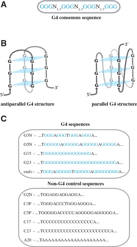 Figure 1. G-quadruplex structures and sequencesA G4 consensus sequence consisting of four stretches of at least three guanines (G) separated by 1–7 random nucleotides (N).B Schematic representation of an antiparallel (left) and a parallel (right) G-quadruplex structure. G-planes stabilized by non-canonical Hoogsteen hydrogen bonds are shown in blue.C G4 sequences and non-G4 control sequences used in this study.