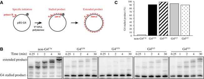 Figure 2. G-quadruplex structures block DNA synthesis by T7 DNA polymeraseA Schematic representation of the primer extension assay. Extension is initiated from 32P-labeled (asterisk) primer B annealed to single-stranded pBluescript DNA containing a G4 sequence (left). If extension is blocked by the G-quadruplex structure, accumulation of a ˜200-nt product is expected (middle) while full extension generates a ˜3,000-nt product (right).B G4 and non-G4 plasmid templates were subjected to primer extension by a modified T7 DNA polymerase (Sequenase). Extension was stopped after the indicated times, and reaction products were separated on 6% urea-PAGE gels and visualized by autoradiography.C The extension stalling products after 1 min (from B) were quantified using ImageQuant software, and the percentage of this product versus the total of products that have arrived or bypassed the G4 sequence is depicted for the various sequences used.