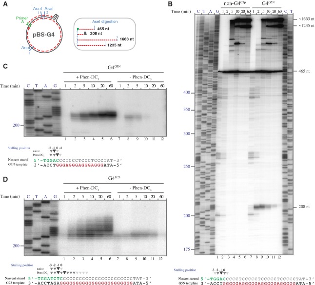 Figure 4. Mapping the sites of replication stalling at G-quadruplex structuresA Schematic representation of a G4 template showing AseI restriction sites. Products formed after AseI digestion and/or replication stalling at the G-quadruplex structure are depicted on the right. Of note, AseI will only cut in double-stranded DNA and thus replication past the site is required.B G4G5N and non-G4C3P plasmids were replicated in HSS. Samples collected at the indicated times were extracted, AseI digested, separated on a high-resolution urea-PAGE sequencing gel and visualized by autoradiography (top). Sequencing ladder generated by extension of primer A on pBluescript allows the mapping of the replication products. Stalling positions are depicted on top of the G4G5N sequence (bottom) and are numbered such that the first nucleotide within the G4 sequence is numbered 0, the last nucleotide 3′ to the G4 sequence is numbered -1 and so forth.C, D G4G3N (C) and G4G23 (D) plasmids were replicated in HSS, in the presence or absence of Phen-DC3, and analyzed as in (B). The sections of the sequencing gels containing the stalled replication products are depicted. Replication stalling sites were mapped and depicted on the relevant G4 sequences below the gels. Stalling positions were numbered as in (B).