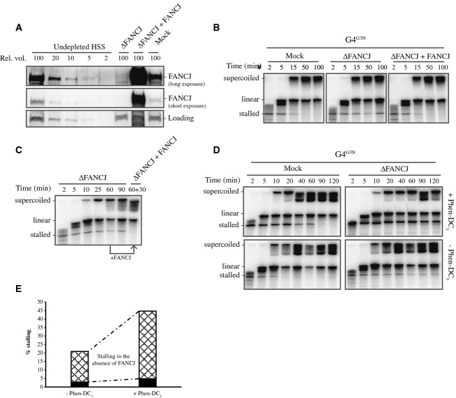 Figure 5. Depletion of FANCJ results in persistent stalling at G-quadruplex structuresA Mock-depleted, FANCJ-depleted, and FANCJ-depleted HSS supplemented with recombinant xlFANCJ were analyzed by Western blotting using xlFANCJ antibody. A dilution series of undepleted extract was loaded on the same blot to determine the degree of depletion. A relative volume of 100 corresponds to 0.7 μl of HSS. A non-specific band cross-reacting with FANCJ antibody is used as a loading control (‘Loading’).B Mock-depleted, FANCJ-depleted, and FANCJ-depleted HSS supplemented with recombinant xlFANCJ were used to replicate the G4G3N plasmid template starting from primer A. Replication products were extracted, separated on 6% urea-PAGE gels, and visualized by autoradiography. Products stalled at the G4 sequence (‘stalled’), linear molecules resulting from denatured nicked products (‘linear’), and closed supercoiled products (‘supercoiled’) are indicated.C G4G3N was replicated in FANCJ-depleted HSS starting from primer A. After 60 min, xlFANCJ or buffer was added followed by an additional 30-min incubation. Replication products were extracted, separated on 6% urea-PAGE gels, and visualized by autoradiography.D Mock-depleted and FANCJ-depleted HSS were used to replicate G4G3N starting from primer A in the absence or presence of a low concentration (0.75 μM) of Phen-DC3. Replication products were extracted, separated on 6% urea-PAGE gels, and visualized by autoradiography.E The G4 stalled and bypassed products of the 90-min time point in (D) were quantified using ImageQuant software, and the percentage of stalling versus bypassed products was plotted for the various conditions. Black bars represent percentage of stalling in the mock-depleted samples, the sum of black and dashed bars represent the percentage of stalling in the FANCJ-depleted samples. Therefore, dashed bars represent percentage of stalling as a result of FANCJ depletion only.