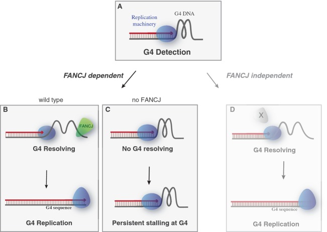 Figure 7. Model for G4 DNA recognition and unwinding during DNA replication(A) When the DNA replication machinery encounters a G-quadruplex structure, it temporarily stalls right at the G4 site (G4 detection). Stable G-quadruplex structures depend on FANCJ for their resolving (B), while others are resolved through FANCJ-independent mechanisms (D) after which DNA synthesis proceeds and the G4 sequence is faithfully replicated. In the absence of FANCJ (C), the G-quadruplex structures are not resolved leading to persistent replication stalling at the G4 sequence.