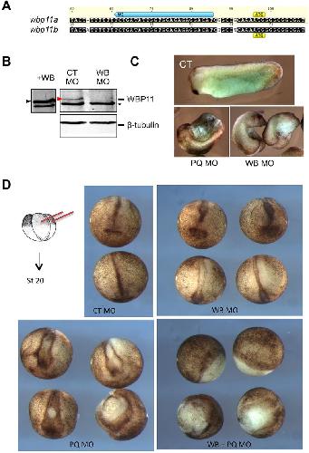 Fig. 4. WBP11 knockdown resembles and enhances PQBP1 knockdown phenotypes. (A) WBP11 MO (blue arrow) targets the 5â² UTR of both X. laevis wbp11 homeologs. (B) Expression of endogenous WBP11 was blocked by injection of 40â
