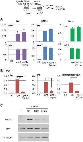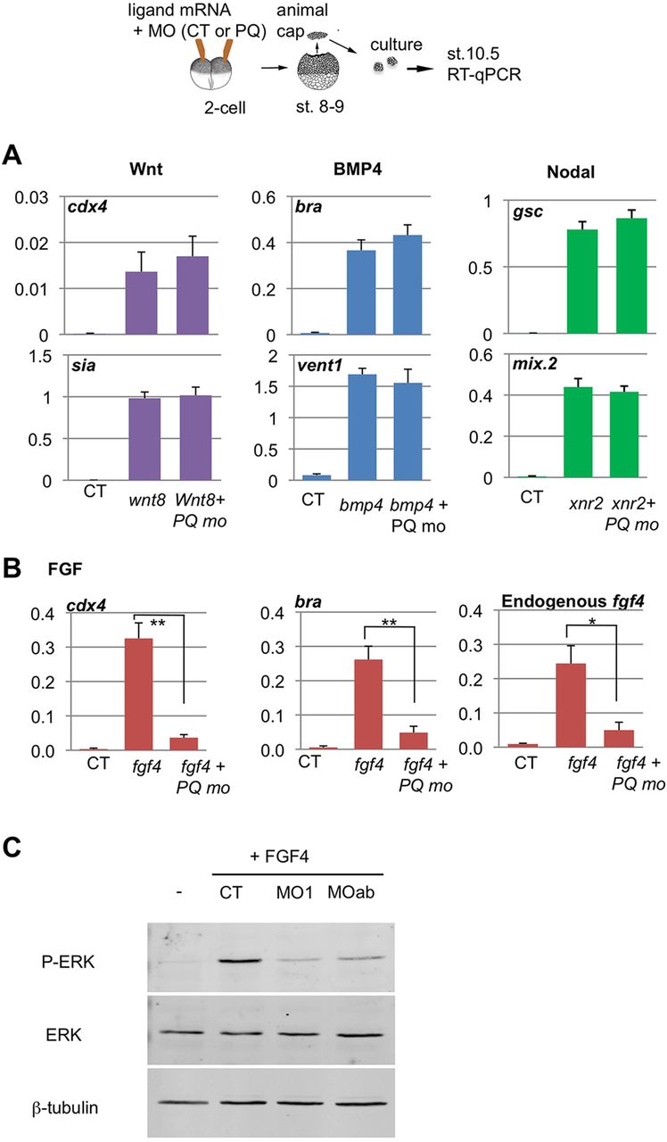 ng MO). There was no statistically significant difference between CT and PQBP1 MO-injected caps treated with each ligand (Student's t-test, n=3). (B) Marker gene induction by FGF4 was significantly reduced by PQBP1 knockdown (*P<0.05 or **P<0.01; Student's t-test, triplicate biological replicates). Animal caps were injected with fgf4 mRNA (1â