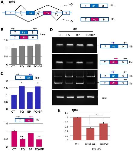ng total). Samples were prepared and analyzed as per Fig. 5 (*P<0.05 or **P<0.01; Student's t-test, n=3). (D) Semi-quantitative RT-PCR amplification products of alternative spliced exon 8a or 8b from embryos injected with morpholinos (as above). (E) Partial rescue of fgf4 expression in pqbp1 morphants (100â