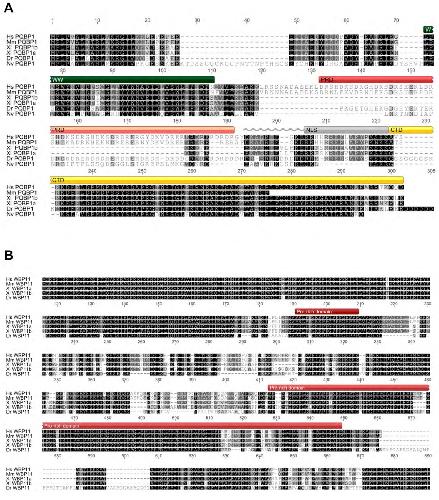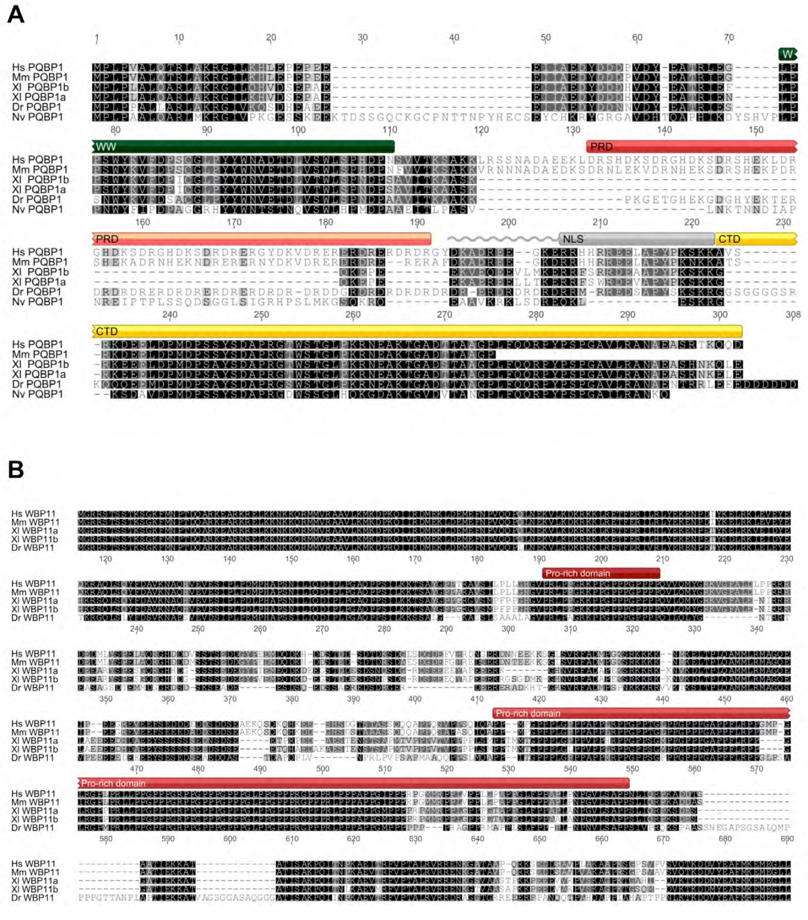 Fig. S1. PQBP1 and WBP11 sequence comparisons. A. Alignment of PQBP1 protein sequences of