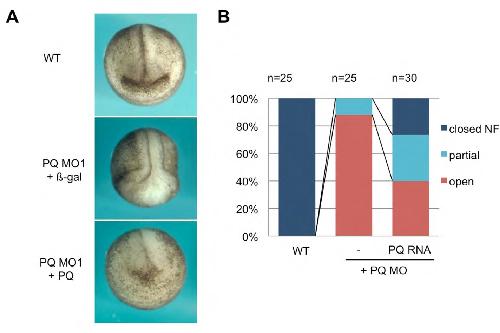 MO1 (40 ng) was dorsally injected with either 2 ng b-galactosidase (b-gal) or pqbp1 (PQ) mRNA. B.
