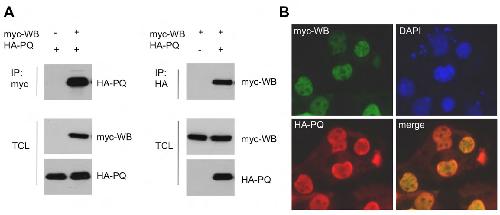 cell lysate. B. Co-immunostaining of myc-tagged WBP11 (myc-WB) and HA-tagged PQBP1 (HA-PQ)
