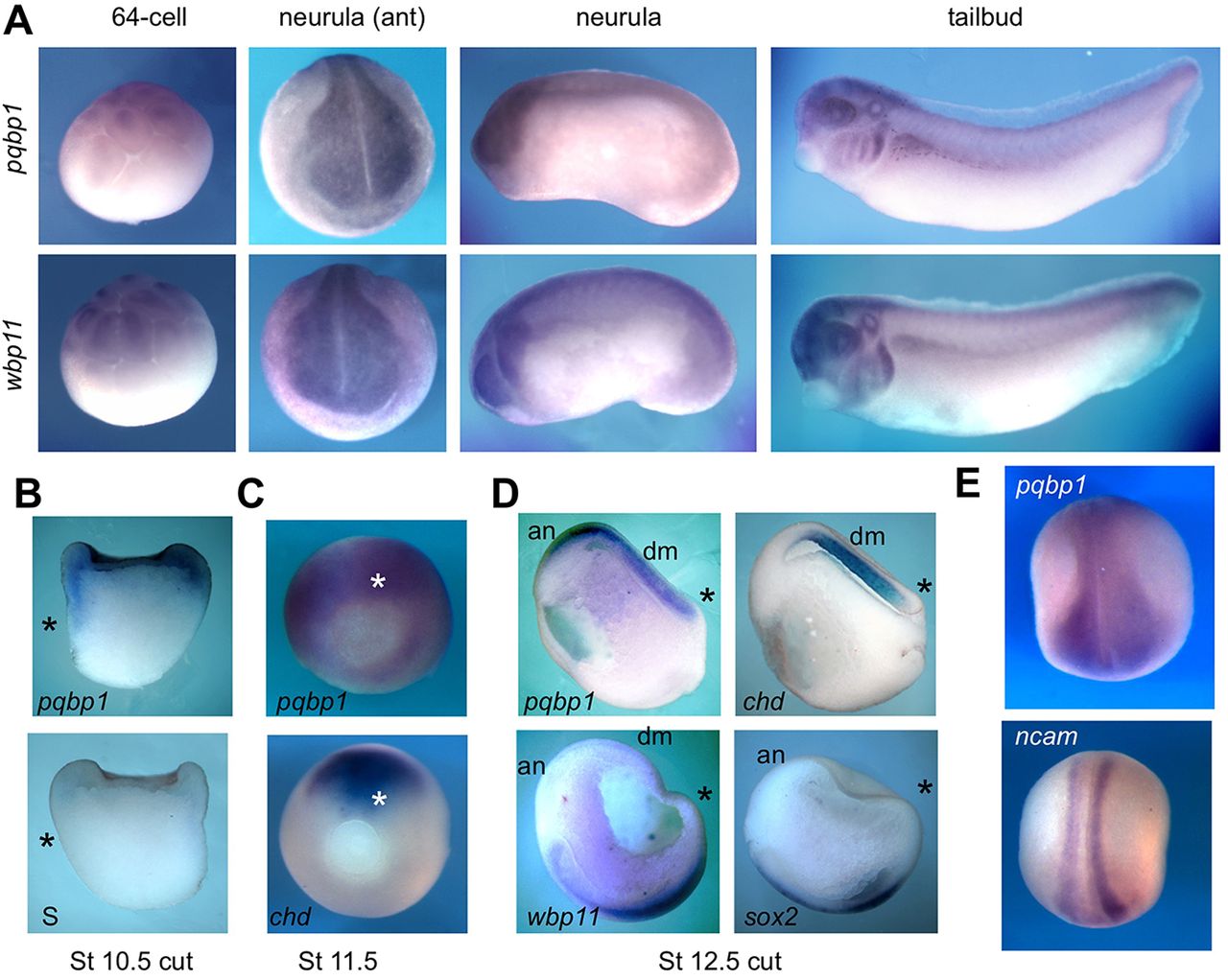 Fig. 1. pqbp1 and wbp11 genes are similarly expressed in mesoderm and neural tissues during Xenopus development. (A) WISH detection of pqbp1 and wbp11 transcripts in 64-cell blastula, neurula and tailbud tadpole; lateral views except anterior (ant) view of neurula. (B-E) WISH on intact (C,E) or longitudinally bisected (B,D) embryos with probes indicated. Asterisks mark the dorsal blastopore lip. (B) pqbp1 transcripts are present in the animal pole ectoderm and marginal zone in early gastrula (stage 10.5), upper panel; sense probe, lower panel. (C) Expression of pqbp1 and chordin in gastrulae, stage 11.5. (D) Expression of pqbp1, wbp11, chordin and sox2 in late gastrulae, dorsal-posterior views. Expression of pqbp1 overlaps with chordin in dorsal/axial mesoderm (arrows) and with sox2 in anterior neurectoderm. (E) Expression of pqbp1 and ncam mRNA in the neural plate of early neurula embryos. Note pqbp1 expression is in a broader region than ncam. an, anterior neurectoderm; chd, chordin; S, pqbp1 sense probe.