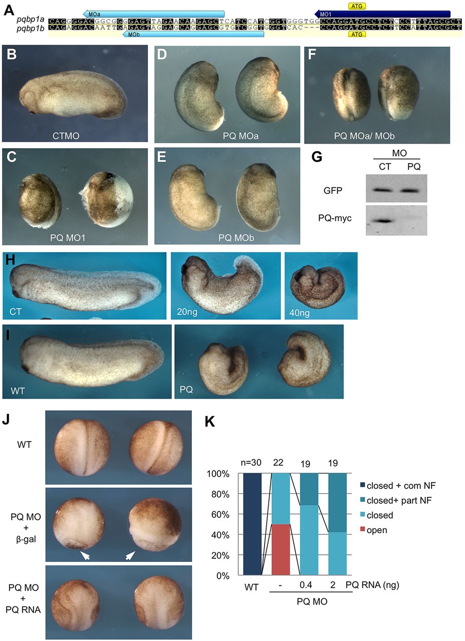 Fig. 2. Knockdown of PQBP1 causes defective embryo morphogenesis. (A) Design of three pqbp1 antisense morpholino oligonucleotides (MOs). MO1 (purple bar) targets the ATG start codon of pqbp1a and pqbp1b (with three nucleotide mismatches), while MOa and MOb (blue bars) target the 5â² UTRs of pqbp1 a and b, respectively. Identical nucleotides between pqbp1 a and b are indicated by black background. (B-F) Tailbud tadpole stage embryos injected bilaterally at the two-cell stage with 50â