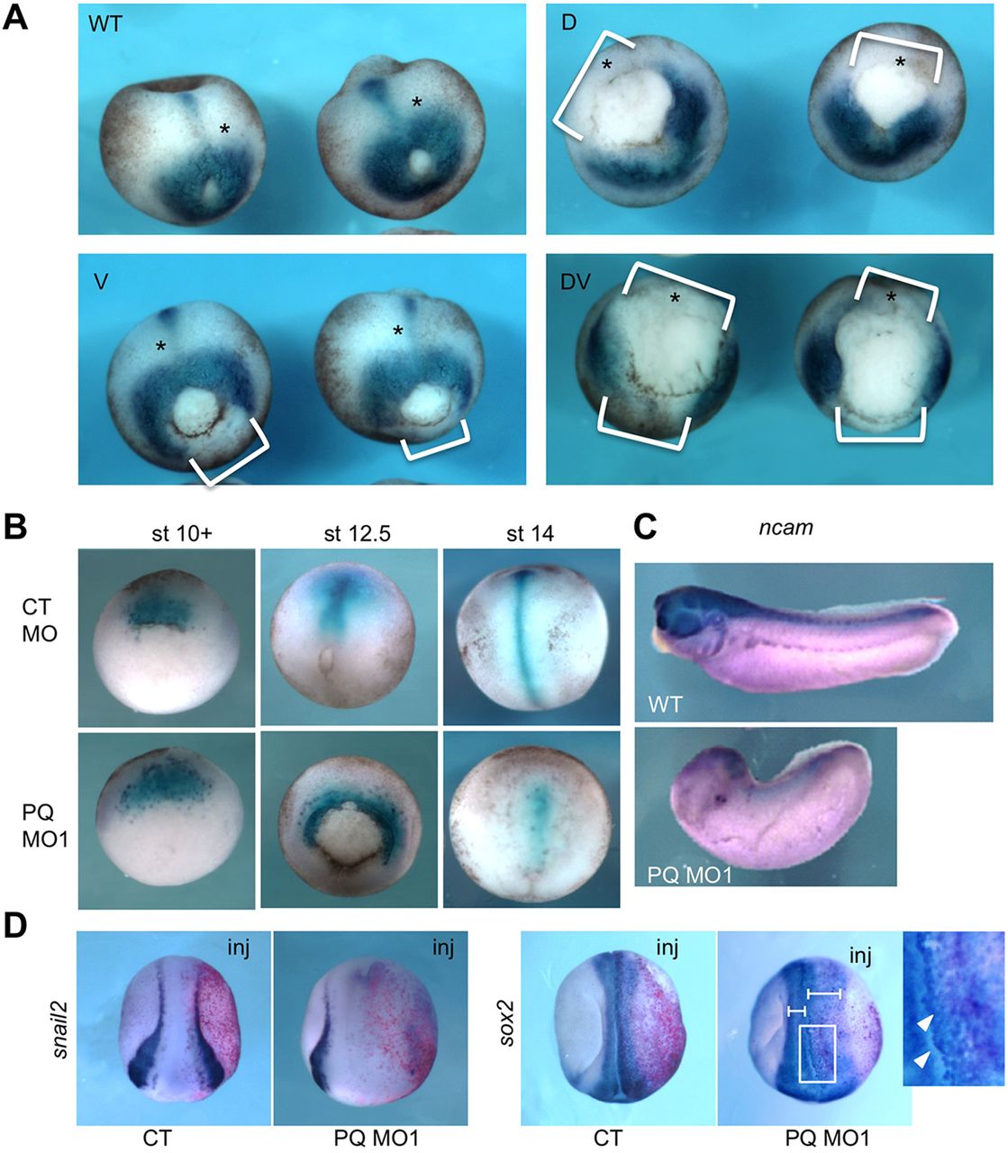 ng of either control MO (CT MO) or pqbp1 MO1 (PQ MO1) at the four-cell stage. (C) Expression of neural marker ncam in uninjected (WT) or pqbp1 MO1-injected embryos targeted dorsally as in B. Lateral views with anterior to left. (D) Expression of the neural crest marker snail2 (slug) and the neural marker sox2 in neurula embryos (stage 19) injected in a single two-cell stage blastomere with 20â