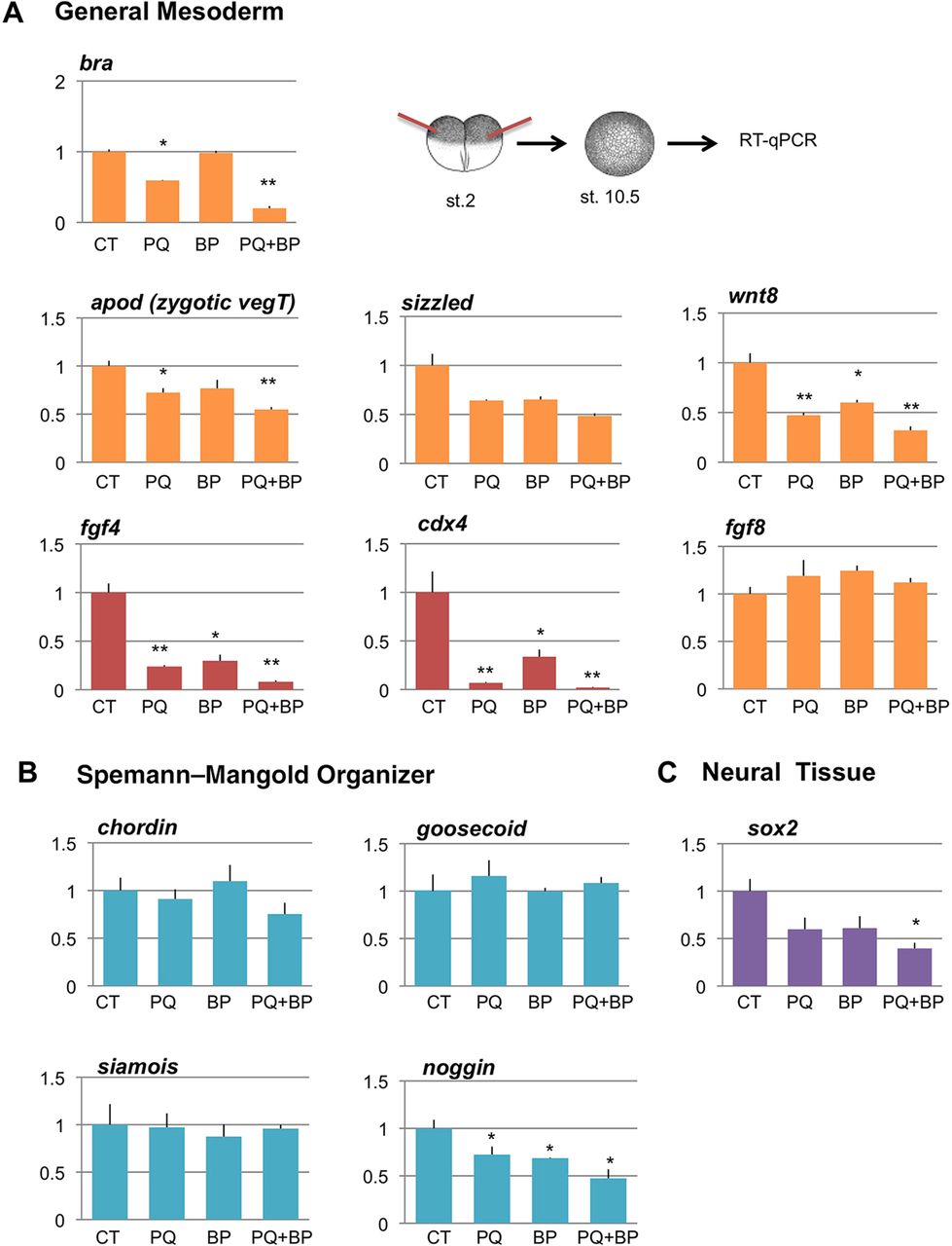 ng total). Values were plotted relative to the control cap signal and shown as mean±s.e.m of n=3 with Student's t-test to control embryos (CT) (*P<0.05 or **P<0.01). (A) Expression of general mesodermal markers brachyury (bra), antipodean (apod), sizzled, wnt8, fgf4, cdx4 and fgf8. (B) Expression of SpemannâMangold organizer-specific markers, chordin, goosecoid, siamois and noggin. (C) Expression of early neural marker sox2.