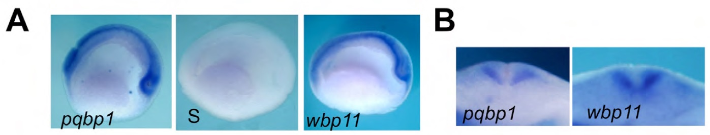 (B) stage 18 embryos. S: sense probe of pqbp1. Both pqbp1 and wbp11 transcripts are
