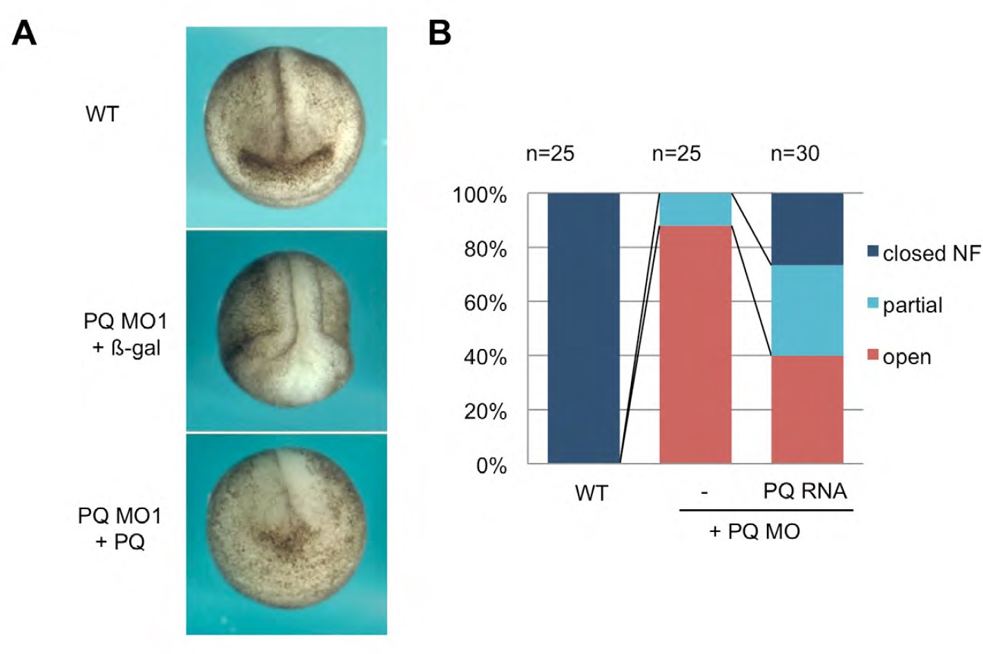 Fraction of embryos displaying specific phenotypes: closed, partially closed or open neural folds (NF).