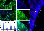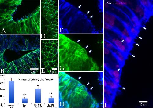 Fig. 6. Both blastomeres of two cell stage embryos were injected with either control (A and D) or Cby (B and E) morpholino (10 ngs/embryo) and membrane-GFP RNA. The neural tube region of stage 26 embryos (A and B) and the gastrocoele roof plate regions of stage 19 embryos (D and E) were dissected and stained for injected membrane-GFP (green) and AAT (blue). Primary cilia were absent or greatly reduced in Cby morphant neural tubes (A and B). (C) To quantitate the effect of the Cby morpholino on primary cilia formation, and the ability of Cby-GFP or SFRP2 RNAs to rescue this effect, 7â10 GFP positive embryos for each group were analyzed. For each embryo, a series of sections were generated and 5 representative images (taken at 40X) were selected and use to calculate mean number of cilia. â**â indicates a p value<0.01 compared to control embryos. In contrast to the effect on primary cilia, gastrocoele roof plate cilia were present in Cby morphant gastrocoele roof plate tissue (D and E). In experiments in which fertilized eggs were injected with Cby-GFP; at stage 25 embryos were fixed, sectioned and stained for AAT (F) or GFP (G); (H) is the overlap of (F) and (G). While cilia are visible (arrows) GFP staining, presumably associated with CbyGFP is not concentrated there. When similar sections from uninjected embryos were stained for centrin (I â magenta) and AAT (blue), centrin was found localized to nuclei (arrows pointing down) but not to the basal body regions of primary cilia (arrows pointing up). Scale bars in part B, E, and I marks 5 μm for parts A and B, D and E, and FâI respectively. |