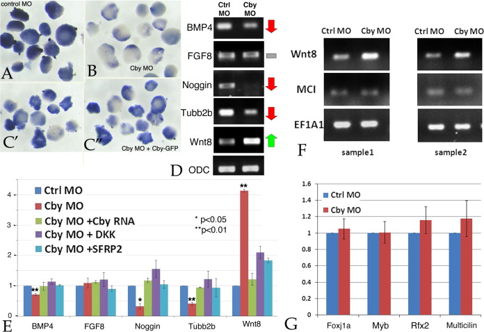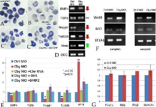 Fig. 7. Ectodermal explants derived from control (A) or Cby (B) morpholino injected embryos were stained in situ for Tubb2b RNA; co-injection of RNA encoding Cby-GFP-rescue (Cʹ and Câ²) increased the level of Tubb2b RNA staining. (D) Control (Ctrl MO) and Cby MO explants were analyzed at stage 18 using RT-PCR; Cby morphant explants displayed decreased levels of BMP4, Noggin, and Tubb2b RNAs, and increased levels of Wnt8a RNA. Levels of FGF8 RNA were unchanged. (E) qPCR analyses of control and Cby morphant explants co-injected with Cby-GFP-rescue, Dkk1, or SRFP2 RNAs. Both Cby-GFP and the two Wnt signaling inhibitors returned all RNAs to control levels. Standard (F) and qPCR (G) analyses of control (Ctrl) and Cby morphant ectodermal explants, analyzed at stage 18, revealed a no change in the levels of the ciliogenesis associated transcription factors Multicilin (F and G), Foxjia, Myb, and Rfx2 (G). |