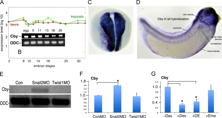 Fig. 1. Cby RNA is supplied maternally and its level remains high throughout early Xenopus development (A) based on Xenbase data for X. laevis (red) and X. tropicalis (green); (B) RT-PCR analysis in X. laevis of Cby RNA at various developmental stages using ornithine decarboxylase (ODC) RNA as the normalizing control. In situ hybridization studies indicate that Cby is expressed at high levels in the neuroectoderm of stage 18 embryos (C); later in embryogenesis (D) Cby is expressed in a range of tissues including the myotome, pronephros, otic vesicle, central nervous system, migrating neural crest, the eye, and blood islands. Standard (E) and qPCR (F) analyses of ectodermal explants derived from control, Snail2/Slug, or Twist1 morpholino (MO) injected embryos revealed an increase in Cby RNA in response to inhibition of Snail2 expression. (G) Ectodermal explants were derived from embryos injected with GR-Snail2 RNA (200 pg/embryo) and either left untreated (âdex) or treated for 2 h with dexamethasone (+dex), dexamethasone and emetine (+dex, +eme), or emetine alone (+eme). Cby RNA levels were measured by qPCR with the Y-axis corresponding to the change in Cby RNA level with respect to control condition, either control MO injected (F) or in the absence of dexamethasone (G). Student t-test values of <0.05 are indicated by a â*â, while a p value<0.01 is indicated by â**â in this and all other figures. |