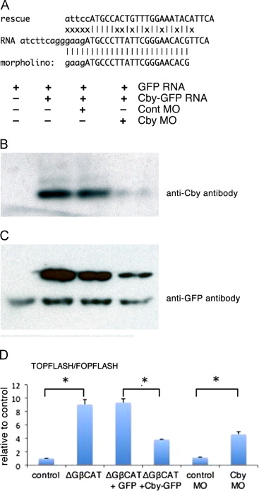 Fig. 2. (A) The Cby MO aligns with the translation start region of the Cby RNA; this same sequence is present in the Cby-GFP-match RNA. An alternative, rescuing version of the Cby-GFP RNA, Cby-GFP-rescue, has a number of mismatches in the morpholino-binding region. Immunoblot analysis was carried out using either an anti-rabbit Cby antibody (B) or an anti-GFP antibody (C); embryos were injected with RNAs encoding GFP (200 pgs/embryo) and Cby-GFP match (200 pg/side) and either control or Cby morpholino (10 ngs/embryo) and analyzed at stage 11. Cby MO reduced Cby and Cby-GFP protein levels. In this experiment, the blot was first probed with anti-GFP antibody (C), then stripped and probed with the anti-Cby antibody (B). (D) Embryos were injected with TOPFLASH and FOPFLASH (control) plasmid DNAs (100 pgs/embryo) together with δG-β-catenin RNA (100 pgs/embryo) either alone or together with GFP or Cby-GFP (100 pgs/embryo) RNAs or control or Cby morpholinos (10 ngs/embryo). The Y-axis indicates fold increase relative to the control TOPFLASH/FOPFLASH value (set equal to 1). Comparisons between conditions are marked by horizontal bars; in each case, p-values were<0.05. |