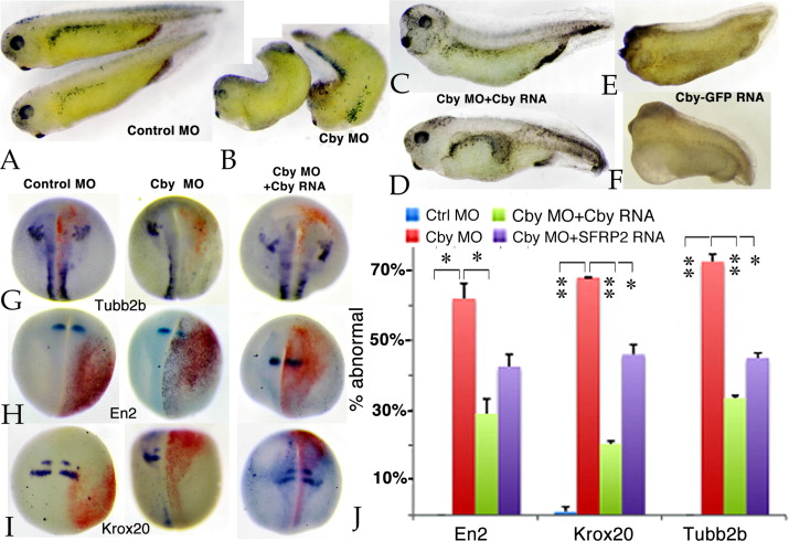 Fig. 3. Compared to uninjected (not shown) or control MO injected embryos (A), Cby MO injected embryos typically displayed a noticeable kink (B); injection of Cby-GFP-rescue RNA together with the Cby MO reversed this kink (C and D), while Cby-GFP-rescue RNA alone produced a distinct phenotype (E and F). In situ hybridization studies revealed the loss of the neural and patterning markers Tubb2b (G), Engrailed (H), and Krox20 (I). These phenotypes were rescued by injection of Cby-GFP-rescue RNA. In panels GâI embryos were injected with either control MO (left panel), Cby MO (center panel), or Cby MO together with Cby-GFP RNA (right panel). All embryos were injected with RNA encoding β-galactosidase as a lineage tracer. Quantitation is provided in panel J. Comparisons between conditions are marked by horizontal bars (* for p<0.05 and ** for p<0.01). |