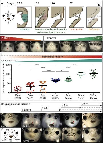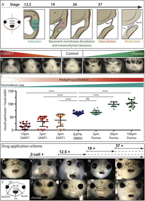 Fig. 1. Hedgehog perturbation affects the size of the oral opening. (A) Schematic illustrating primary mouth development. Frontal view of Xenopus tadpole indicates sectional plane for schematics. Stage 12.5, primary mouth induction occurs anterior to the prechordal plate (PP), notochord (Nc) and neural plate (NP). Stage 19 foregutendoderm (Fg) abuts mouthectoderm (Ec, pink), separated by fibronectin-rich basement membrane (BM, green), between forebrain (Fb) and cement gland (CG). BM dissolves and mesenchymal clearance thins stomodeum (green dashed line indicates BM). Stage 37, buccopharyngeal membrane (BPM) formation. Stage 40, BPM perforation. (BâD) Frontal view of stage 45 tadpoles incubated from 2-cell stage with 10 μM (B), 5 μM (C), or 2 μM SANT1 (D) (B, n=13/13, C, n=16/16, D, n=15/15). Primary mouth is indicated by red arrowhead. (E) Control tadpole, 0.07% DMSO (n=26/26). (FâH) Tadpoles incubated with 2 μM (F), 20 μM (G) or 100 μM purmorphamine (H). Increase in mouth size was observed with increasing concentrations of purmorphamine (F, n=70/70, G, n=43/43, H, n=154/154). (I) Quantification of mouth size for 10 μM, 5 μM, or 2 μM SANT1, 0.07% DMSO, 2 μM, 20 μM or 100 μM purmorphamine, where mouth perimeter is normalized to width of the head. ââââP<0.001. Scheme indicating primary mouth size (green) in relationship to Hh activity (red bar). (J) Stage 45 control tadpole. (Jʹ) Facial anatomy schematic. (KâN) Tadpoles incubated with 250 μM cyclopamine from 2-cell stage (K), between stages 12.5â19 (L), 19â37 (M), or from 37 (N). (OâR) Tadpoles treated with 100 μM purmorphamine from the 2-cell stage (O), between stages 12.5â19 (P), 19â37 (Q), or from stage 37 (R).