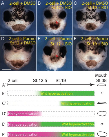 Fig. 3. Wnt inhibition acts downstream of Hh signaling during BPM dissolution. (AâF) Stage 38 tadpoles. (A) Control tadpole incubated with 0.7% DMSO continuously from 2-cell stage. (B) Tadpole incubated with 0.7% DMSO, then 15 μM BIO from stage 12.5 (n=34). (C) Tadpole incubated with 0.7% DMSO, then 15 μM BIO from stage 19 (n=34). (D) Tadpole incubated with 100 μM purmorphamine, then 0.07% DMSO from stage 12.5 (n=34). Primary mouth is enlarged. (E) Tadpole incubated with 100 μM purmorphamine, then 15 μM BIO from stage 12.5 (n=34). (F) Tadpole incubated with 100 μM purmorphamine, then 15 μM BIO from stage 19 (n=34). Scale bars indicate 100 μm. (G) Schematic indicating drug application scheme and outcome. Red arrowheads (B and E) indicate absence of primary mouth.
