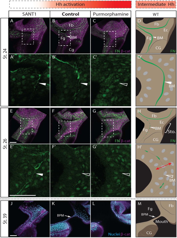 Fig. 2. Hedgehog signaling is necessary and sufficient for basement membrane dissolution. (AâC, EâGʹ) Sagittal sections through primary mouth stained for β-catenin in magenta, fibronectin (FN) and nuclei in green. (Fg) foregut, (BM) basement membrane, (Fb) forebrain, (Cg) cement gland. (AâC) Stage 24. (A) Embryo treated with 10 μM SANT1 from the 2-cell stage. (Aʹ) Magnified view of endodermâectoderm interface and basement membrane. FN is observed (white arrowhead) (n=7). (B) Control. (Bʹ) FN immunofluorescence indicates the presence of BM between foregut and ectoderm (white arrowhead, n=7). (C) Embryo treated with 250 μM purmorphamine. (Cʹ) No FN immuofluorescence is observed between foregut and ectoderm (open white arrowhead, n=6/7). (DâDʹ) Schematic indicating anatomy of sections represented in BâBʹ. Fibronectin-rich basement membrane separates foregut and ectoderm. (EâGʹ) Stage 26. (E) Embryo treated with 10 μM SANT1. (Eʹ) shows persistent FN immunofluorescence (white arrowhead, n=8). (F) Stage 26 control. (Fʹ) Almost no BM FN is observed in controls (open arrowhead, n=12). (G) Stage 26 embryo treated with 100 μM purmorphamine. (Gʹ) No FN immuofluorescence is observed (open white arrowhead, n=10). (HâHʹ) Schematic indicating anatomy of WT sections represented in FâFʹ. Fibronectin-rich basement membrane is absent or broken, foregut and ectoderm cells mix (red arrow). (JâL) Sagittal sections of stage 39 tadpoles stained for β-catenin (magenta) and DAPI. (J) Tadpole treated with 10 μM SANT1 (n=5). (K) Control tadpole. BPM is observed as a single layer epithelium (n=6). (L) Tadpole treated with 100 μM purmorphamine. No BPM is present (n=4). Scale bars indicate 50 μm. (M) Schematic indicating anatomy of WT sections represented in (K). Buccopharyngeal membrane (BPM) separates foregut from external environment and indicates site of future mouth.