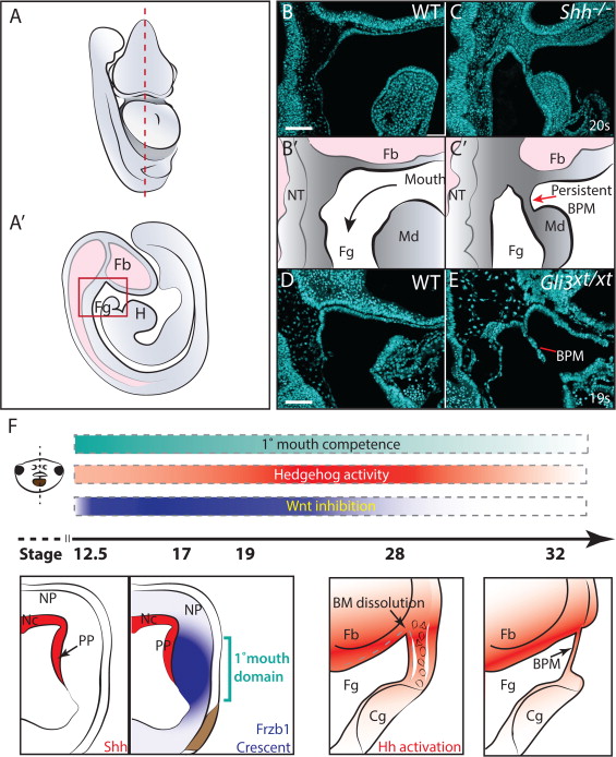 Fig. 4. Sonic hedgehog and Gli3 are required for perforation of the mammalian BPM. (A) Schematic frontal view of E9.0 mouse embryo. Dashed line indicates section plane. (B) Schematic of section. Red box indicates region represented in panels (C) and (Dʹ). (Fb) forebrain, (Fg) pharyngeal foregut, (H) Heart. (CâD) Nuclei are stained with DAPI (cyan) (B) Sagittal section of E9.0 (20 somite) Shh+/+ embryo (n=3). (Bʹ) Schematic illustrating anatomy in (B). (C) Sagittal section through E9.0 Shhâ/â embryo (n=3). (Cʹ) Schematic illustrating anatomy depicted in (C). (DâE) Sagittal sections through E9.0 (19 somite) Gli3+/+ and Gli3xt/xt embryos, respectively. Remnant buccopharyngeal membrane (BPM) is observed in Shhâ/âand Gli3xt/xt embryos. Nuclei are stained with DAPI (cyan). Scale bars indicate 100 μm. BâC are littermates, as are DâE. (F) Proposed model of primary mouth formation in Xenopus. Frontal schematic indicates sectional plane of diagrams. Cyan bar indicates stages of primary mouth competence. Red bar indicates level of Hh activation while blue indicates Wnt inhibition, where white is none, and bright color is high. Wnt inhibitors Crescent and Frzb-1 are expressed in primary mouthectoderm (blue). Primary mouthectoderm is induced adjacent to Hh signal where Wnt inhibition is highest (cyan bracket). By stage 28, BM is indicated by white outlines, and mesenchymal cells are illustrated in black. Hh signal activation (red) is highest ventral to the forebrain (Fb). (Cg) and (Fg) indicate cement gland and foregut, respectively. Wnt inhibitors are no longer expressed, and stomodeum is refractive to Wnt activation. By stage 39, endodermâectoderm intercalation forms monolayer buccopharyngeal membrane (BPM). Hh signal activation is required through intercalation stages.