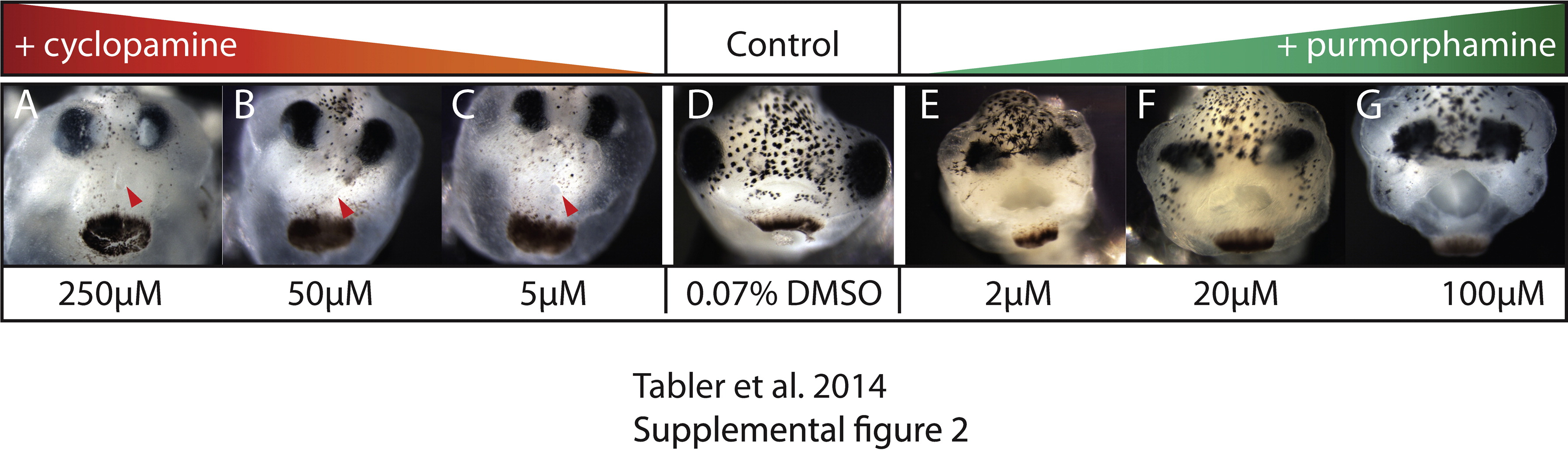 related to Figure 1: Hh signaling exhibits dose dependent regulation of primary mouth size. (AâG) Frontal view of stage 45 tadpoles incubated from the 2-cell stage with 250 μM cyclopamine (A), 50 μM cyclopamine (B), or 5 μM cyclopamine (C) (A, n=35, B, n=35, C, n=150). (D) Control tadpole incubated with 0.7% DMSO from the 2-cell stage. (EâG) Tadpoles incubated with 2 μM purmorphamine (E), 20 μM purmorphamine (F) or 100 μM purmorphamine (G). Primary mouth is indicated by red arrowheads. Cyclopamine caused a loss of the primary mouth perforation. A dose dependent increase in mouth size was observed with increasing concentrations of purmorphamine (E, n=35, F, n=35, G, n=140). Red gradient indicates Hh activation, and green bar indicates primary mouth size relative to Hh activation.