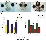 related to Figure 1: Activation and inhibition of Hh signaling narrow the head. (AâC) Dorsal views of stage 45 tadpoles. (A) Control treated tadpole. (B) 250 μM cyclopamine treated from the 2-cell stage. Eyes (black) are close-set and head is narrow compared to controls. (C) Tadpole treated with 100 μM purmorphamine from the 2-cell stage. Eyes (black) are close-set and head is narrower than controls. (D) Graph showing total width of head at the level of the eye (blue) and the distance between eyes (yellow) in stage 45 tadpoles. According to both measurements cyclopamine and purmorphamine treatment significantly decreased the width of tadpole heads compared to control treated tadpoles (p<0.001, cyclopamine treated compared to control, and p<0.001, purmorphamine compared to control). Diagram indicates measurement planes. (E) Graph indicating head length from the anterior-most extent of the head to either the posterior (green) or anterior extent of the eye (red). According to both measurements cyclopamine and purmorphamine treatment significantly decreased head length compared to controls (p<0.001, cyclopamine treated compared to control, and p<0.001, purmorphamine compared to control). Diagram indicates measurement planes.