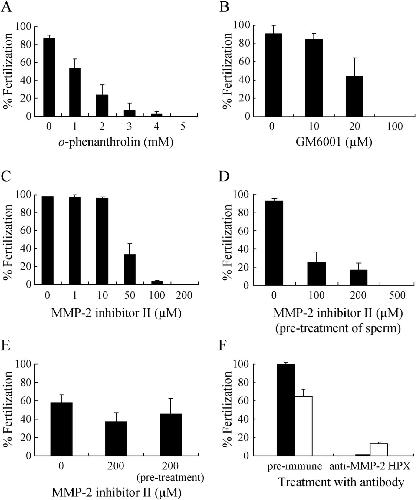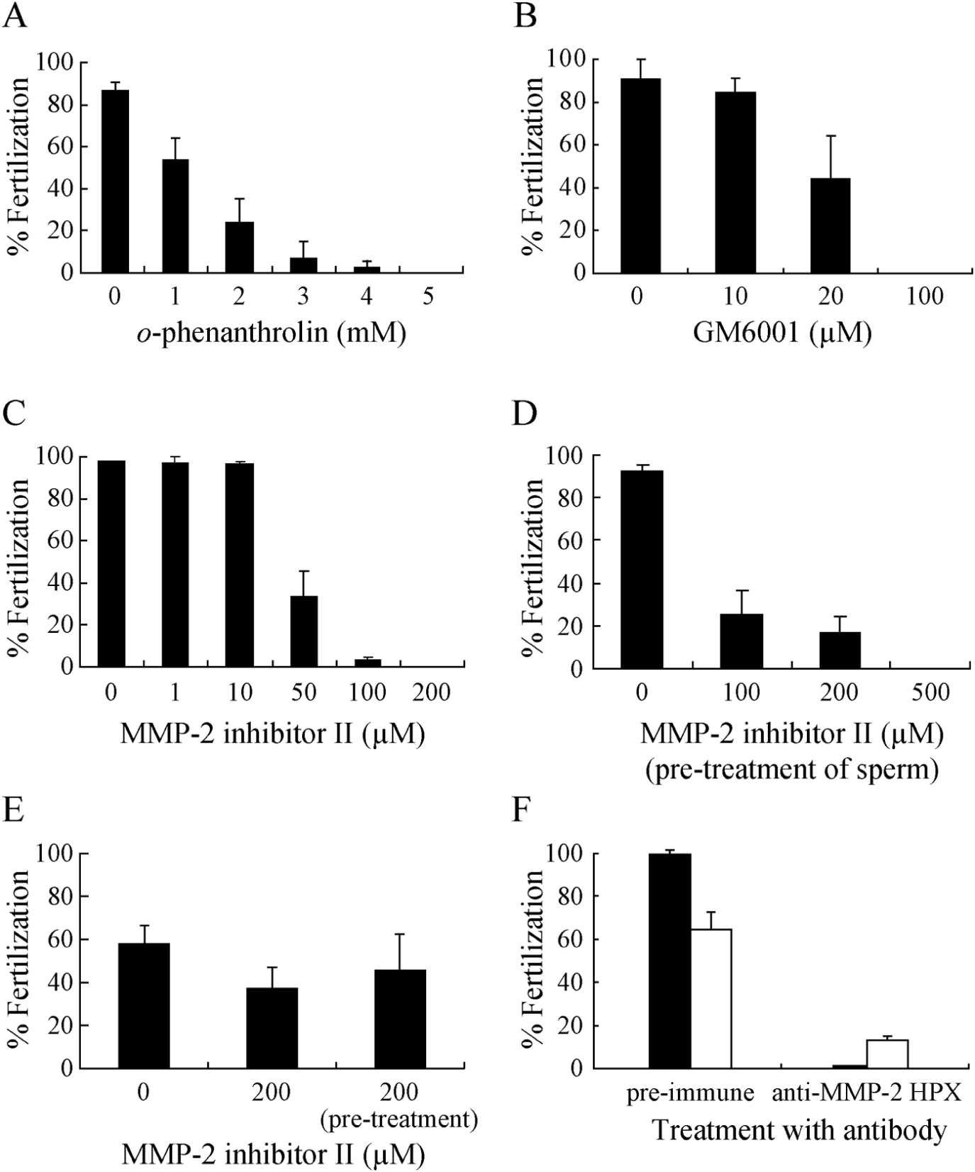 The rate of fertilization of jellied eggs in the presence of inhibitors for broad MMPs: o-phenanthrolin (A) and GM6001 (B), and an inhibitor more specific for MMP-2: MMP-2 inhibitor II (Ki: 2.4, 45 and 379âµM for MMP-2, MMP-1 and MMP-7, respectively) (C), showing that the enzymatic activity of MMP-2 is necessary for fertilization of jellied eggs. Fertilization of jellied egg was inhibited when the sperm were treated the inhibitor specific for MMP-2 inhibitor II (D), indicating the involvement of MMP-2 in the sperm for fertilization. The fertilization in denuded eggs was not affected by MMP-2 inhibitor II (E) either in the presence at insemination or in the pretreatment of sperm before insemination (pre-treatment), but the treatment of sperm with anti-MMP-2 HPX antibody inhibited fertilization in both jellied eggs (F, closed bars) and denuded eggs (F, open bars), indicating that the MMP-2 HPX domain is necessary for the membrane interaction between the sperm and eggs at fertilization.
