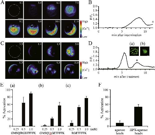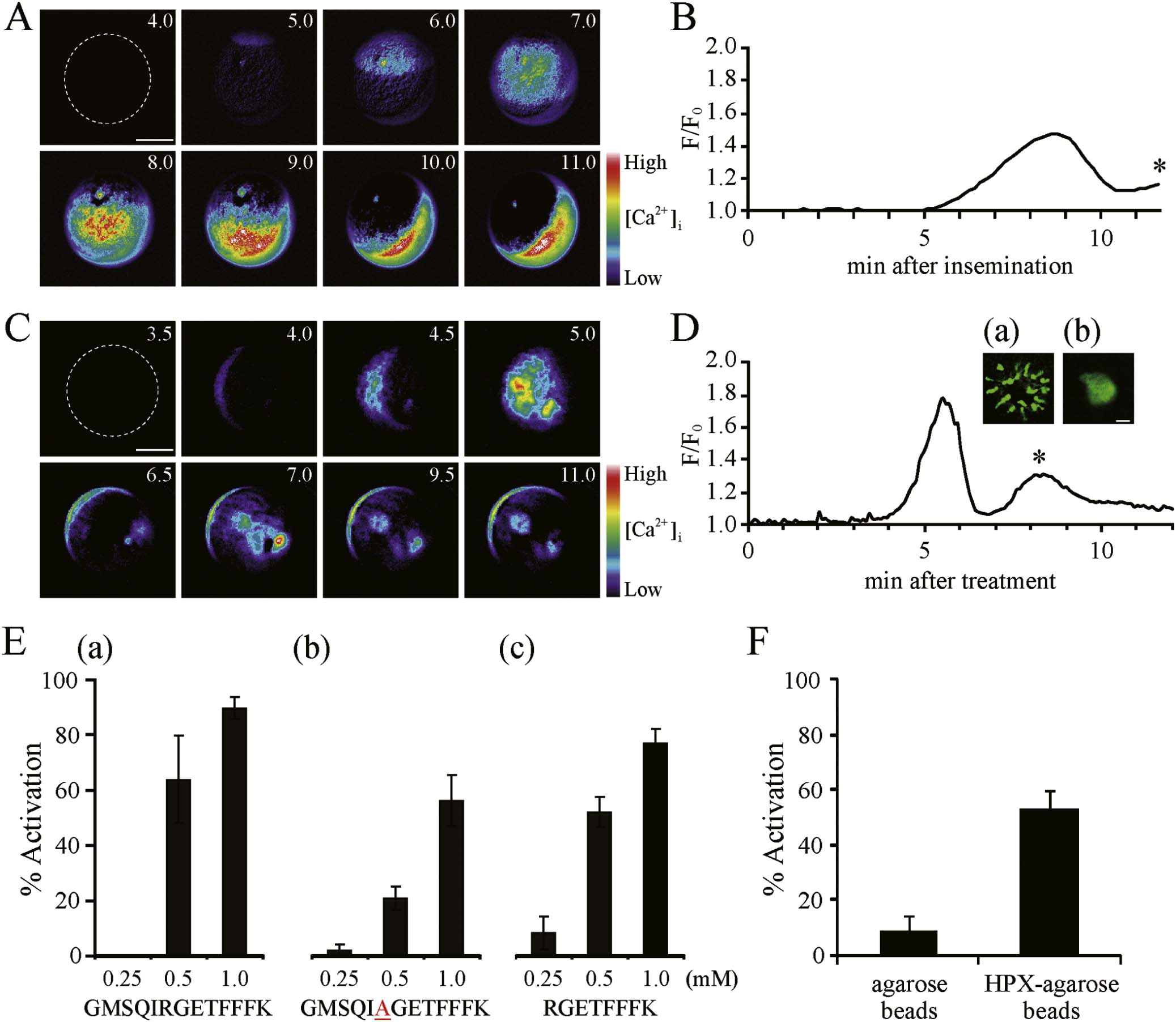 (A) and (B) A typical increase in [Ca2+]i induced by the fertilizing sperm in a dejellied egg, showing the propagation of a Ca2+ wave from the sperm entrance site toward the opposite site. The increase in [Ca2+]i was initiated 5âmin after insemination and continued about 5âmin. The second increase in fluorescence intensity (*) is an artifact by the appearance of white surface of vegetal hemisphere during cortical contraction after passing the Ca2+ wave. Numbers on the top right of figures (C and D) show time (min) after insemination. Bar, 0.5âmm. (C) and (D) A typical increase in [Ca2+]i induced by the treatment of the HPX peptide (473â485; GMSQIRGETFFFK, 2âmM, 20âµL) in a dejellied egg, showing the increase in [Ca2+]i which was initiated 4âmin after treatment and spread over the egg surface for 3âmin. The resumption meiosis in metaphase II-arrested unfertilized eggs (D-a) was confirmed by the formation of an egg pronucleus (D-b). The second peak in fluorescence intensity (*) is an artifact by the appearance of white surface of vegetal hemisphere during cortical contraction after passing the Ca2+ wave. Numbers on the top right show time (min) after treatment. Bar, 0.5âmm (A) and 10âµm (D). (E) The activation of dejellied eggs by the treatment with the HPX peptides, showing higher activities by GMSQIRGETFFFK (473â485) (a) and by RGETFFK (478â485) (c), but lower activity by GMSQIAGETFFFK (R475A) (b). In each column, 40â50 eggs were examined (meanâ±âSEM, nâ=â4). (F) The activation of denuded eggs by the treatment with agarose-beads conjugated by GMSQIRGETFFFK (473â485), indicating signal transduction for egg activation on the egg plasma membrane. In each column, 37â45 eggs were examined (meanâ±âSEM, nâ=â3).