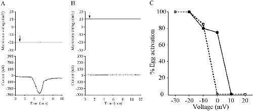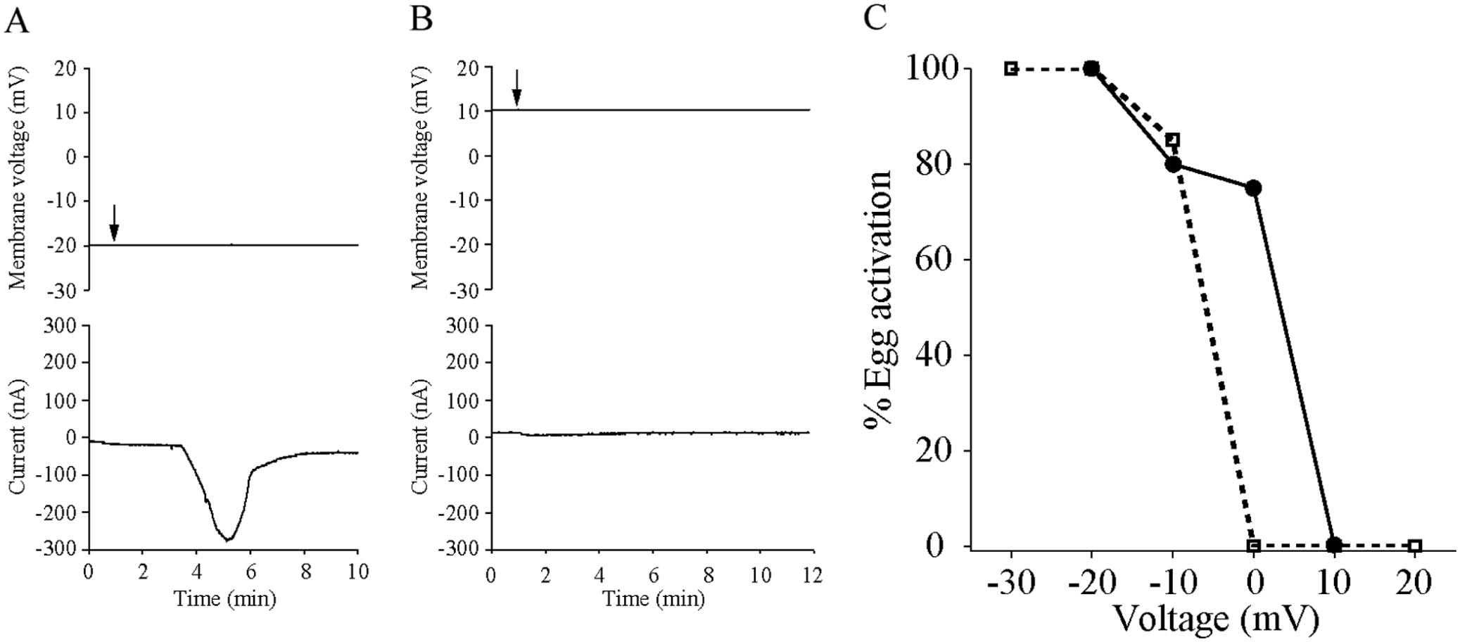 Voltage-dependency of egg activation by the fertilizing sperm and the HPX peptide (A and B). Dejellied eggs were voltage-clamped at â20âmV (A) or +10âmV (B), respectively, and then treated with the HPX peptide (GMSQIRGETFFFK, 2âmM, 20âµL), showing egg activation in the egg at â20âmV accompanied with a large inward current (activation current) about 4âmin after treatment (A), but no change in the holding current in the egg at +10âmV (B). (C) Voltage-dependent egg activation by the sperm (open squares) or by the treatment with the HPX peptide (GMSQIRGETFFFK, 2âmM, 20âµL) (closed circles). No egg underwent activation during voltages at higher than 0âmV by the sperm or +10âmV by the HPX peptide, respectively. Percentage of egg activation is plotted as a function of the clamp potential. Each point represents results from 10 to 20 eggs.