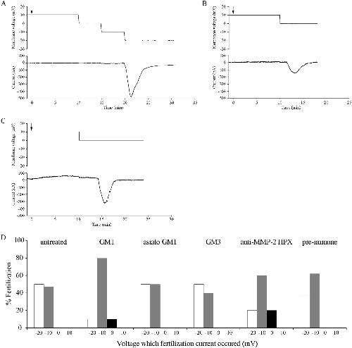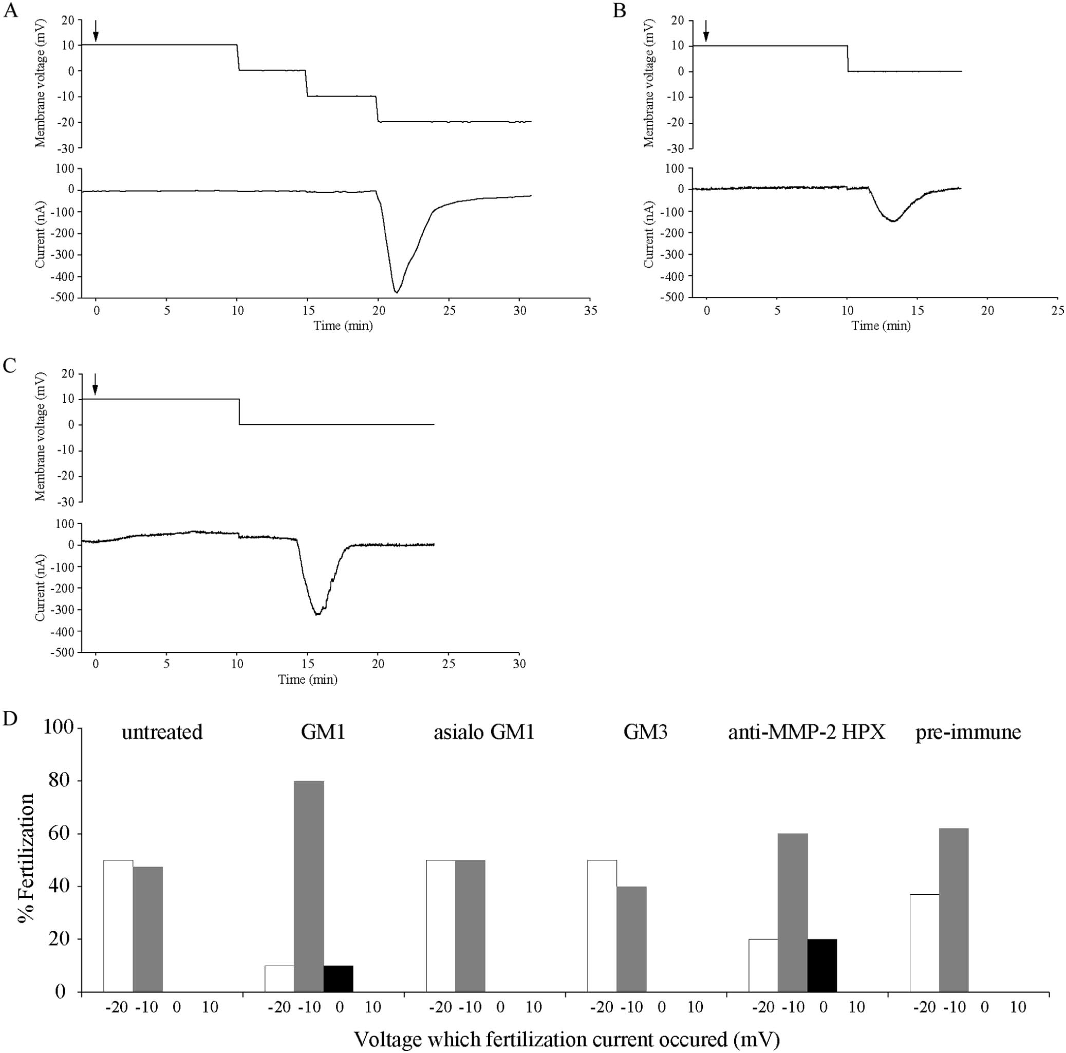 Changes of voltage-dependency in fertilization by the treatment of sperm with gangliosides or anti-MMP-2 HPX antibody. (AâD) Jellied eggs were voltage-clamped at +10âmV and then inseminated. At 10âmin after insemination, the clamp voltage was negatively shifted in incremental steps (10âmV-step, for 5âmin). Fertilization current (egg activation) was elicited at â20âmV by untreated sperm (A), but at 0âmV by the sperm which had been treated with GM1 (100âµg/mL, 15âmin) (B), or by the sperm which had been treated with anti-MMP-2 HPX antibody (1:100-dilution, 15âmin) (C). Untreated sperm caused activation in about half of the eggs at â10âmV or â20âmV (untreated), but 10% and 80% of the eggs were activated by GM1-treated sperm at 0âmV and â10âmV, respectively (GM1). The treatment of sperm with asialo GM1 or GM3 (100âµg/mL, 15âmin) did not affect the voltage dependency (asialo GM1, GM3). The sperm which had been treated with anti-MMP-2 HPX antibody (1:100-dilution, 15âmin) caused activation in 20% and 60% of the eggs at 0 mV and â10âmV, respectively (anti-MMP-2 HPX). No egg was activated at 0âmV by the sperm treated by preimmune antibody (preimmune). Each column represents results from 10 to 30 eggs.