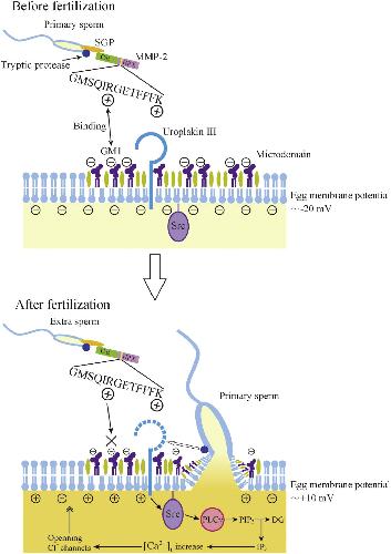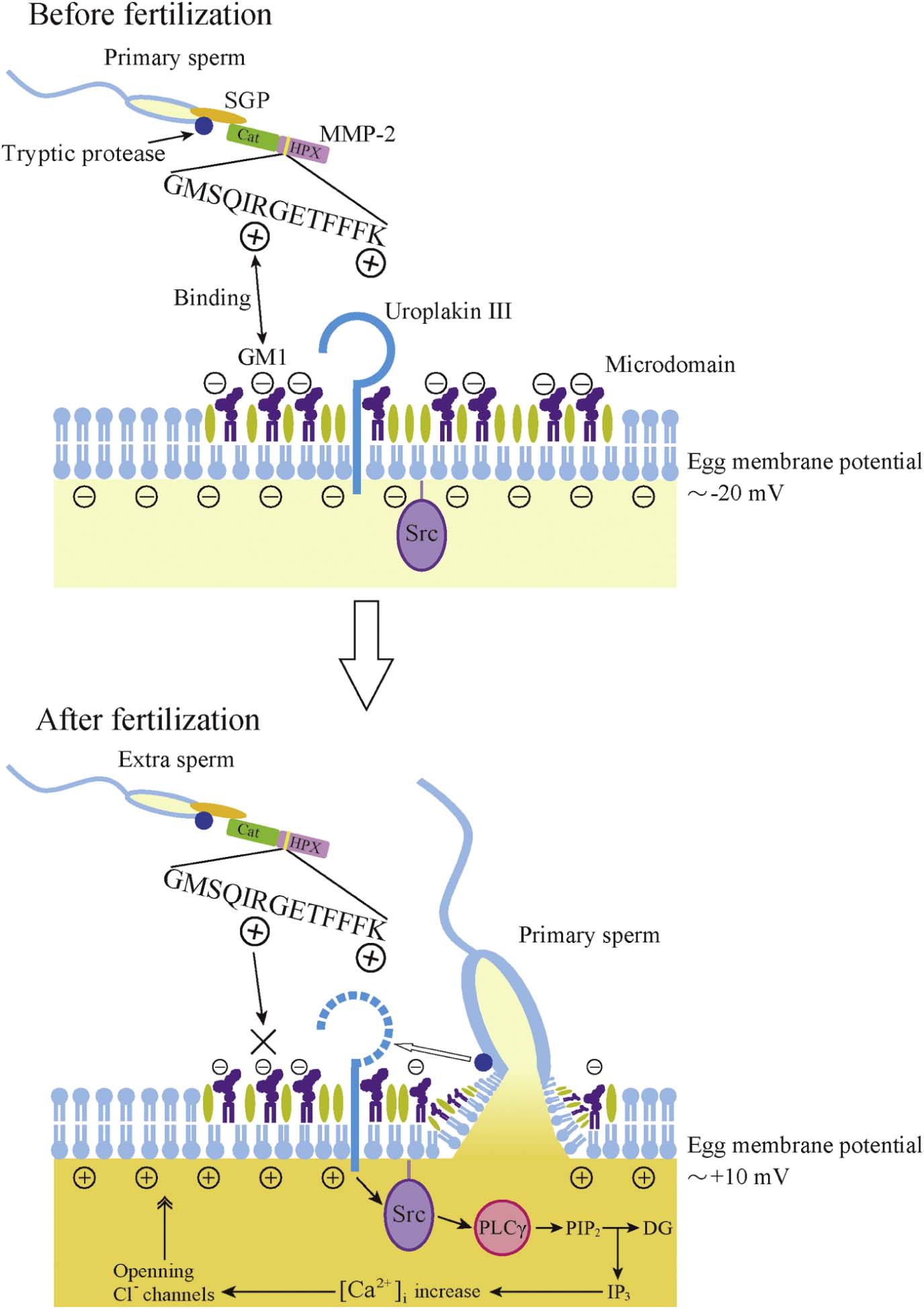 A schematic model of voltage-dependent fertilization (egg activation) based on an interaction between the MMP-2 HPX domain on the sperm membrane and GM1 in the MD of egg membrane. Since the membrane potential of unfertilized eggs is negative (about –20 mV), positively charged MMP-2 HPX domain can bind to interact with negatively charged GM1 in the MD of egg plasma membrane. Short forms of MMP-2 with the HPX domain might be also involved in this interaction. The bound sperm transmits a signal for the increase in [Ca2+]i to activate the egg, probably through partial digestion of uroplakin III (UPIII) by a sperm tryptic protease, followed by the activation of Src kinase (Src) and phospholipase Cγ (PLC). IP3 produced by PLCγ releases Ca2+ ions from the ER to open Ca2+-sensitive Cl–-channels on the egg membrane, which elicits a positive fertilization potential higher than 0 mV. The positive membrane potential might inhibit the interaction between the MMP-2 HPX domain in the extra sperm and GM1 to prevent polyspermy.