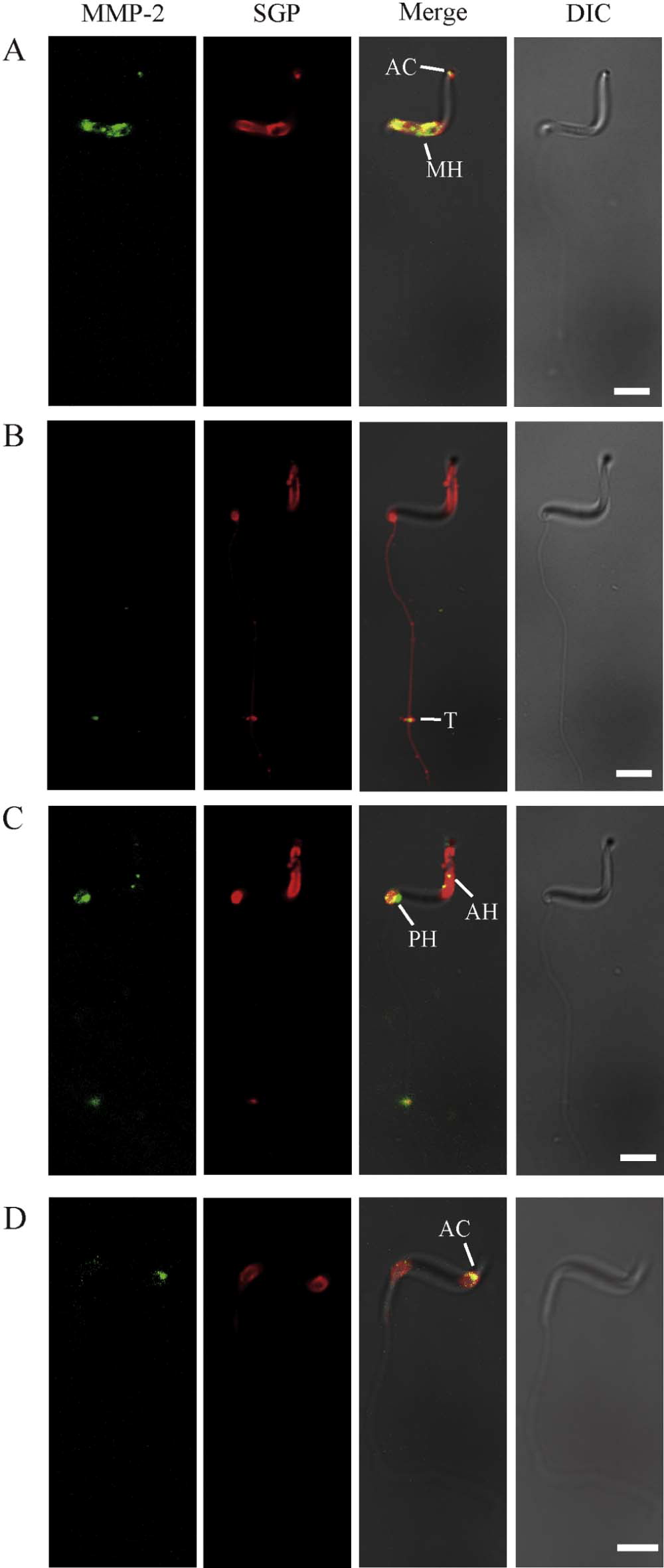 Colocalization of MMP-2 and SGP on the sperm surface. Sperm were treated with anti-MMP-2 HPX antibody and anti-SGP antibody followed by the secondary antibodies, showing the distribution of MMP-2 (green) in the head region including in acrosomal region (AC) and the middle and posterior portions of head (MH and PH). A small amount of MMP-2 was localized in the anterior portion of head (AH) and the tail region (T). SGP was distributed over the entire sperm surface (red). MMP-2 was colocalized with SGP on the sperm surface (merge with DIC image). Since the images (AâC) were taken from the same sperm with 1âµm-thick optical slices, only some areas of the sperm surface were shown in each image. The sperm were treated with Ca2+ ionophore A23187 (10âµM, 15âmin) to induce acrosome reaction, and then treated with the antibodies, showing the localization of MMP-2 around the acrosomal region at the tip of the head (Fig. 2D). DIC, Differential interference contrast microscopy. Bars, 5âµm.