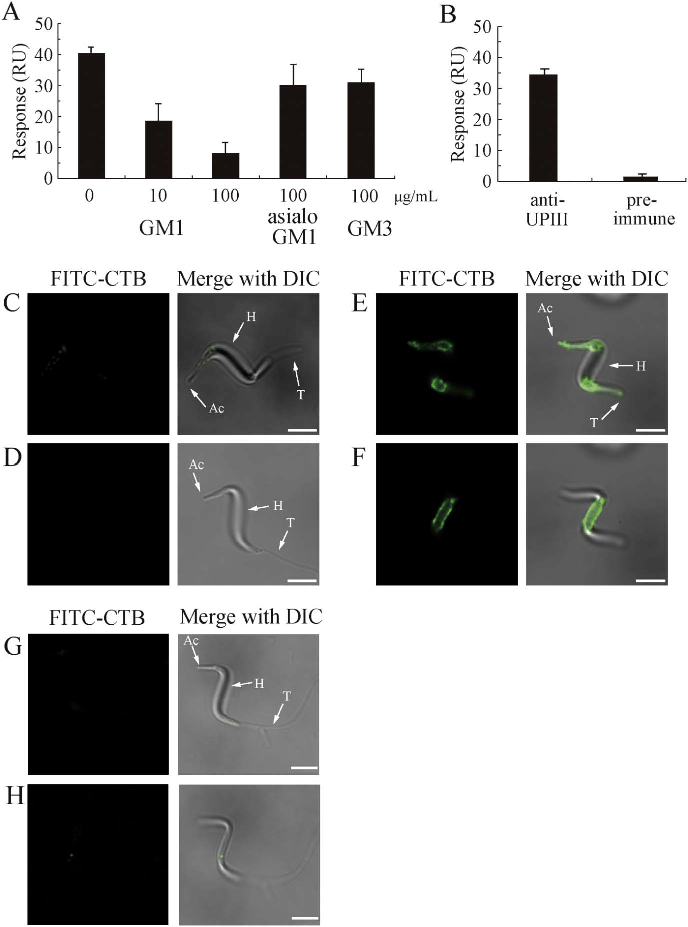 (A) Interactions of the microdomain (MD) of egg membrane with the HPX peptide (473â485; GMSQIRGETFFFK), showing binding of the MD to the HPX peptide captured on a sensor chip for SPR system (Biacore). Binding of the MD was inhibited in the presence of GM1, but not of asialo GM or GM3. RU, resonance unit (1âpg/mm2). (B) The presence of uroplakin III (UPIII) in the MD bound to the HPX peptide was confirmed by further binding of anti-UPIII antibody on the chip. (CâH) Detection of GM1 on the sperm surface with FITC-conjugated cholera toxin B subunit (FITC-CTB), showing a very small amount of GM1 on the GM1-untreated sperm (C) in comparison with the sperm without treatment of FITC-CTB (D), but a large amount of GM1 bound the sperm after treatment of the sperm with GM1 (100âµg/mL, 15âmin) (E and F). The binding of GM1 on the sperm was inhibited by the pre-treatment of sperm with anti-MMP-2 HPX antibody (1:10-dilution, 20âmin) (G and H). The set of E and F or G and H is showing different optical slices in the same sperm, respectively. Left panels, the fluorescence images of FITC-CTB; Right panels, the merge of fluorescence images with differential interference images (DIC). Ac, acrosomal region; H, head; T, tail. Bar, 5âµm.