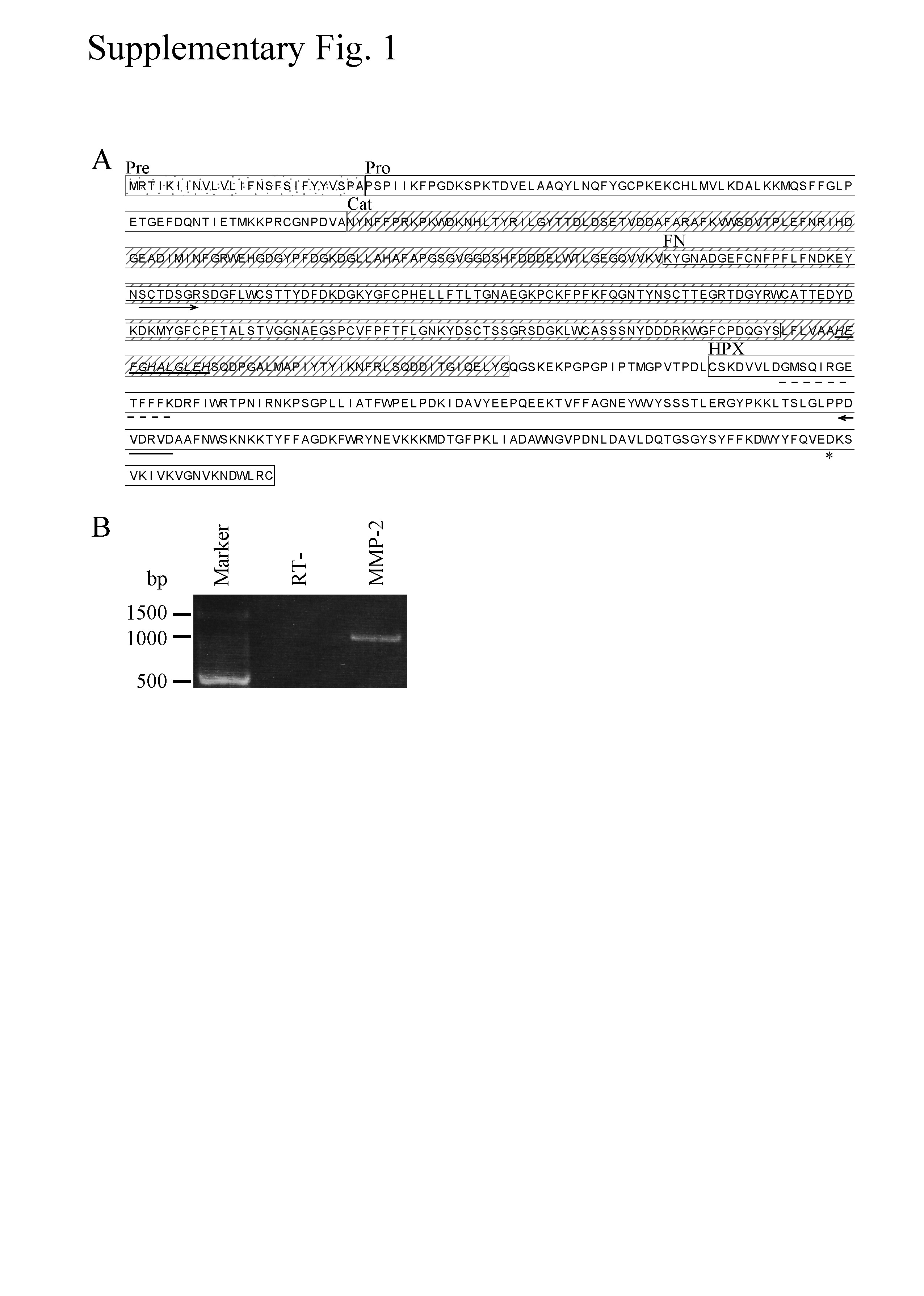 (A) Amino acid sequence and domain structure of Xenopus laevis testis MMP-2, showing a signal peptide (Pre), a prodomain (Pro), a typical catalytic domain (Cat) with zinc binding region (underline), a fibronectin-like collagen-binging domain (FN), and a hemopexin domain (HPX). Asterisk, glutamic acid (E) in Xenopus laevis tadpole tail MMP-2 (GenBank, AY037943). Arrows, the position of primers for RT-PCR. Dotted line, HPX peptide. (B) RT-PCR analysis for confirmation of the expression of MMP-2 in Xenopus laevis testis. RT reaction was performed with GeneRacer kit (Invitrogen), and poly (A) RNA extract was used as a negative control (RTâ). The reaction products were subjected to PCR (95â°C for 30âsec, 56â°C for 1âmin, 72â°C for 2âmin) for 30 cycles; the forward and reverse PCR primers specific for MMP-2 were 5â²-CTGCACTGATTCTGGTCGCTC-3â² and 5â²-TCAACACGATCAACATCAGGA-3â², respectively.