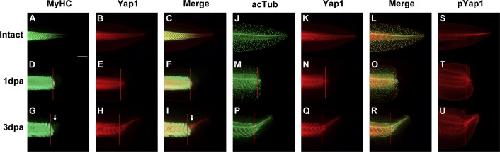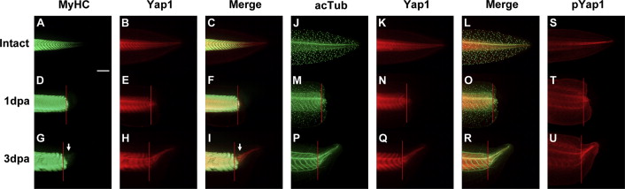 Fig. 1. Distribution of Yap1 protein during tadpole tail regeneration. Tadpole tails were amputated at st41/42 and subjected to whole-mount immunofluorescent staining. (A)â(I) Yap1 and Sarcomeric Myosin heavy chain (MyHC) co-immunofluorescent staining. (J)â(R) Yap1 and acetylated Tubulin (acTub) co-immunofluorescent staining. Muscles (white arrow) and spinal cord initiated regeneration at 3 dpa (days post amputation). Yap1 protein was broadly distributed in the regenerating tail. Nerve axons appear as linear and branched acTub staining signals, and the punctate acTub signals in the tail samples at 0 and 1 dpa were ciliated cells in the skin ((J)â(O)). (S)â(U) Immunofluorescent staining of phosphorylated Yap1 (pYap1), the inactive form of Yap1. pYap1 was preferentially distributed in the tip of the intact notochord (S) and regenerating notochord (U). Red line indicates the amputation plane. Scale bar=500 µm.