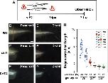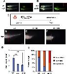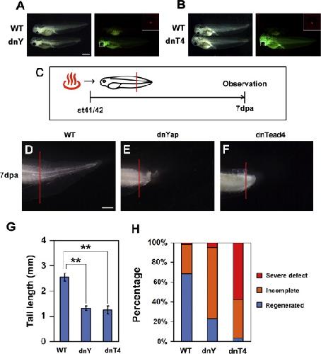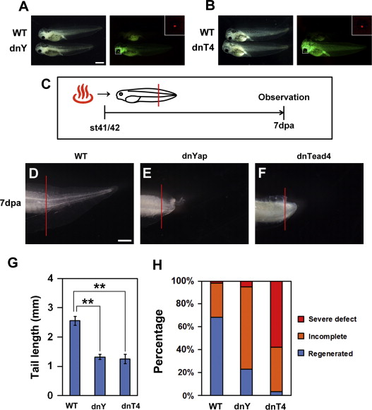 Fig. 2. Tail regeneration is impaired by dnYap or dnTead4 induction. (A) and (B) Transgene expression was induced by heat shock. Tadpoles were subjected to heat shock at st41/42, and GFP reporter expression was observed 3 h later in the dnYap (dnY) and the dnTead4 (dnT4), but not in the wild type (WT, heat-shocked) tadpole. The dnY and dnT4 tadpoles could be distinguished from WT by lens-specific tdTomato fluorescence under control of the gamma crystallin promoter. Inset is a high-power view of a tdTomato-positive lens. (C) Experimental schedule. Tadpoles at st41/42 were heat shocked 3 h prior to amputation, and observed at 7 dpa (days post amputation). (D)â(F) Regenerated tails were observed after fixation and bleaching. While WT tadpoles had regenerated an almost complete tail at 7 dpa (D), the dnYap and dnTead4 tadpoles did not. The pictures show the âsevere defectâ phenotype ((E) and (F)). Red line indicates the amputation plane. (G) Measured length of the regenerated tail (the average length). The regenerated tail length in dnYap and dnTead4 Tg was significantly shorter than that in WT (double asterisks: p<0.01, Welchâs t-test). Error bar indicates s.e.m. (H) Percentage of WT, dnYap, and dnTead4 tadpoles displaying varying degrees of the regenerative response, from âsevere defectâ (least regenerative) to âregeneratedâ (most regenerative) after the heat shock procedure described in (C). The degree of regeneration was markedly reduced in the dnYap1 and dnTead4 Tg tadpoles. Scale bar=500 µm.