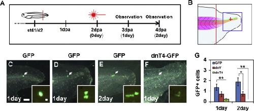 Fig. 4. Yap and Tead4 are cell-autonomously required for the cell survival of neural progenitors in the spinal cord. (A) Experimental schedule for labeling neural progenitors at the single-cell level by IR-LEGO. (B) Cartoon of the regenerating tail. Green line represents the spinal cord, and light orange region represents the notochord. Red line indicates the amputation plane. Blue square marks the photographed region shown in CâF, and the red cross indicates the point targeted by IR-REGO. (C)â(F) A single neural progenitor cell in the spinal cord was induced to express GFP or dnTead4 tagged with GFP (dnT4-GFP) by infrared laser irradiation at 2 dpa (days post amputation). White arrow indicates the irradiated site. Insets indicate high-power views of the fluorescent images of the irradiated cell and its descendants. (C) A single cell was induced to express GFP by infrared laser irradiation. (D) and (E). Another example showing active cell division. Two GFP-positive cells appeared 1 day after irradiation, suggesting cell that division occurred before the GFP expression was detected (D) and the cell number was increased the next day (E). (F) A single cell was induced to express dnTead4 tagged with GFP by the same infrared laser irradiation as in (C)â(E). The dnTead4 expression cell-autonomously affected cell survival and mitosis. Note that the GFP-positive cell has a crumpled appearance, and looks like a dying cell. (G) Average number of GFP-expressing cells after each irradiation. The induced dominant-negative proteins significantly reduced the cell number in dnYap Tg 2 days and in dnTead4 Tg 1 and 2 days after irradiation. Error bar indicates s.e.m. Scale bar in CâF=100 µm and in inset=10 µm. Single and double asterisks indicate statistically significant differences between WT and Tg tadpoles at p<0.05 and p<0.01 (Welchâs t-test), respectively.