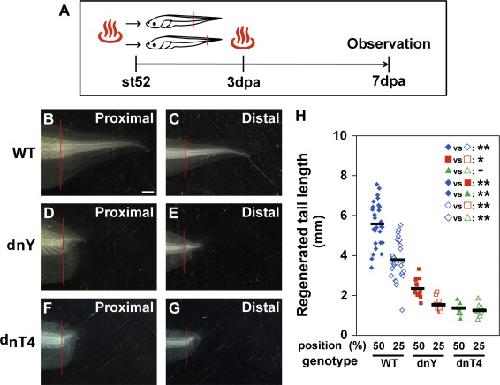 Fig. 5. Tead4 contributes to position-dependent growth control. Experimental schedule. The tail of st52 tadpoles was amputated 3 h after the first heat shock. Tadpoles were heat shocked again at 3 dpa. Note that the observation of resultant tail regeneration at 7 dpa is far earlier than the onset of metamorphic tail regression that normally starts at st62 (Nieuwkoop and Faber, 1994). (B) and (C). WT (heat shocked) regenerated tail 7 days after amputation at the proximal (B) and distal (C) level (50% and 25% of the distance from the tail tip to the cloaca, respectively). The growth rate in the tail amputated at the proximal level was faster than that in the tail amputated at the distal level during the same period. (D) and (E) dnYap Tg regenerated tail 7 days after amputation at the proximal (D) and distal (E) level. (F) and (G) dnTead4 Tg regenerated tail 7 days after amputation at the proximal (F) and distal (G) level. Tail regeneration in the dnYap and dnTead4 Tg tadpoles was impaired and shortened after both proximal and distal amputation. Red line indicates the amputation plane. Scale bar (BâG)=1 mm. (H) Scatter graph of the regenerated tail (the average length). The difference between the proximal and distal regenerated tail length was severely decreased in the dnYap and dnTead4 Tg tadpoles. Horizontal bars indicate average length of regenerated tail. Single and double asterisks indicate statistically significant differences at p<0.05 and p<0.01 (Welchâs t-test) between the distal and proximal growth, respectively. Minus mark indicates no significant difference (Welchâs t-test). Error bar indicates s.e.m.