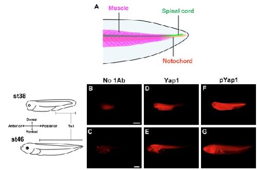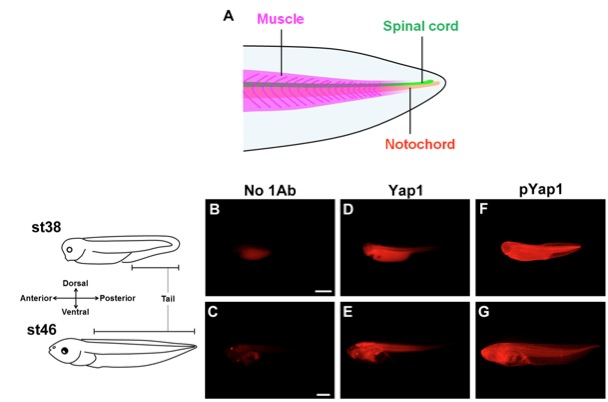 A. Cartoon of the Xenopus tadpole tail, which is composed of various types of tissues. B-G. Whole-mount immunofluorescent staining at the tailbud stage (B, D, F) and early tadpole stage (C, E, G). B, C. Negative control without primary antibody. D, E. Immunostaining for Yap1. Yap1 protein was distributed throughout the whole body. F, G. Immunostaining for phosphorylated Yap1 (pYap1). The anti-pYap1 antibody recognizes the phosphorylated serine in a conserved motif of the Yap1 protein. This phosphorylation sequesters Yap1 from the nucleus and inactivates the transcription of Yap1âs target genes. B, D, F. st38 embryos. C, E, G. st46 tadpoles. Scale bar = 1 mm.