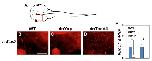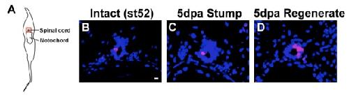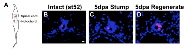 pH3 immunofluorescent staining (red) on cross sections counterstained with DAPI (blue). A. Cartoon of a transverse section of the Xenopus tadpole tail. The dorsal side is up. Orange square shows the spinal cord region photographed in B-D. B. Intact spinal cord at st52. C. Spinal cord in the stump at 5 dpa (days post amputation). D. Spinal cord in the regenerating tail at 5 dpa. Scale bar = 10 µm.