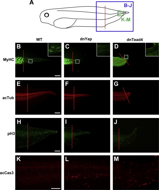 Fig. 3. dnYap and dnTead4 expressions affect cell differentiation, cell proliferation, and cell death in tail regeneration. The regenerated tail of WT and Tg tadpoles was subjected to whole-mount immunofluorescent staining at 7 dpa (days post amputation). (A) Cartoon of the regenerating tadpole tail. Red line indicates the amputation plane. Photographs in (B)â(J) show the caudal region marked by the blue square, and those in (K)â(M) show a more restricted tail region marked by the green square. (B)â(D) MyHC immunostaining showed clustered myocytes that had already initiated regeneration in the WT tail (heat-shocked). In contrast, only fibrous myocytes were seen in the dnYap and dnTead4 Tg tadpoles. Inset indicates the high-power view of the white-boxed region. (E)â(G) acTub immunostaining marked an appropriately elongated nerve axon in the WT and shortened nerve axons in the dnYap and dnTead4 Tg regenerating tail. (H)â(J) pH3 immunostaining, which indicates mitotic cells, showed that cell proliferation in the regenerating tail was reduced in the dnYap and dnTead4 Tg tadpoles. (K)â(M) acCas3 immunostaining, indicating apoptotic cells. High-power view of the tip of the regenerating tail showed very few apoptotic cells in the regenerating WT tail. In contrast, ectopic apoptosis was frequently observed in the regenerating tail of dnYap and dnTead4 Tg tadpoles. Scale bar=100 µm in (K)â(M) and 500 µm in (B)â(J).