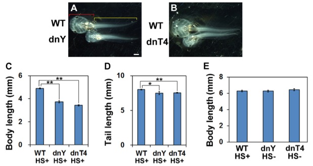 Tadpole body length and tail length were measured 7 days after heat shock, as indicated in Fig. 2C without amputation. A. WT and dnYap Tg tadpoles 7 days after heat shock. The body length and tail length were measured as the distance from the rostral edge of the head to the cloaca (red bracket) and the distance from the cloaca to the tail tip (yellow bracket), respectively. B. WT and dnTead4 Tg tadpoles at 7 days after heat shock. C. Body length 7 days after heat shock (the average length). The body length of the dnYap and dnTead4 Tg tadpoles was significantly reduced. Error bar indicates s.e.m. D. Tail length 7 days after heat shock (the average length). Yap1 and Tead4 inhibition had less of an effect on tail elongation. E. Comparison of body lengths among WT siblings heat-shocked at st41/42, dnYap Tg tadpoles without heat shock and dnTead4 Tg tadpoles without heat shock at 7 days after st41/42. In dnYap and dnTead4, no inhibitory effect on tadpole growth was observed without heat shock. Error bar indicates s.e.m. Scale bar = 1 mm in A, B. Single and double asterisks indicate a statistically significant difference between WT and Tg tadpoles at p<0.05 and p<0.01 (Welchâs t-test), respectively