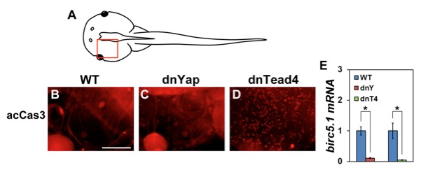 Stage 41/42 tadpoles were heat shocked, fixed 7 days later, as shown in Fig. 2C without tail amputation, and subjected to whole-mount immunofluorescent staining. A. Cartoon of the immunostained tadpole. Orange square indicates the photographed region shown in B-D. B-D. Active Caspase3 (acCas3) staining indicating apoptotic cells. Apoptosis was slightly increased in dnYap Tg and more markedly increased in dnTead4 Tg tadpoles. E. qPCR for birc5.1 (survivin). bicr5.1 expression was significantly reduced in the dnYap and dnTead4 Tg tadpoles. cDNA was synthesized from the total RNA extracted from whole tadpoles 2 days after heat shock. Single asterisk indicates a statistically significant difference at p<0.05 (Welchâs t-test). Error bar indicates s.e.m.