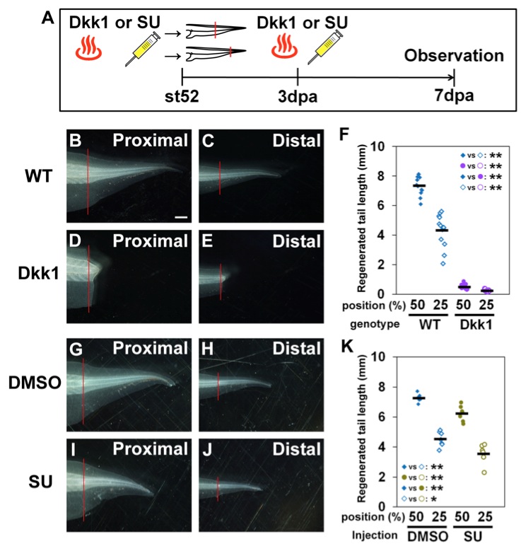 A. Experimental schedule. To inhibit Wnt/β-catenin signaling, st52 Dkk1 tadpoles were heat-shocked 3 hours before tail amputation. The tadpoles were heat-shocked again at 3 dpa. After heat shock, the induction of Dkk1 was confirmed by GFP fluorescence (data not shown; Dkk1 was tagged with GFP. See Materials and Methods.). To inhibit Fgf signaling, 5 μl of 100 μM SU5402 or control DMSO was injected into tadpoles 3 hours before tail amputation. The same injection was repeated at 3 dpa. B, C. WT regenerated tail at 7 days after amputation at the proximal (B) and distal (C) levels (50% and 25% of the distance from the tail tip to the cloaca, respectively). The growth rate in the tail amputated at the proximal level was faster than that in the tail amputated at the distal level during the same period. D, E. Dkk1 Tg regenerated tails 7 days after amputation at the proximal (D) and distal (E) levels. F. Scatter graph of the regenerated tail lengths. Tail regeneration in Dkk1 tadpoles was almost completely blocked at both the proximal and distal amputation levels, as represented by the flat slope of Dkk1 close to â0â. This graph is distinct from the same analysis in dnYap or dnTead4 tadpoles (Fig. 5H), in which the slope was steeper, especially in the dnTead4 tadpoles, and the regenerated tail was longer than 1 mm, suggesting that regeneration itself was not inhibited. Error bar indicates s.e.m. (WT: 7.35 ± 0.19 mm for proximal amputation and 4.33 ± 0.30 mm for distal, Dkk1: 0.50 ± 0.04 mm for proximal and 0.25 ± 0.02 mm for distal, n=12 and 13 for WT proximal and distal, n=14 and 12 for Dkk1 proximal and distal, respectively). G, H. Regenerated tails of DMSO-treated tadpoles 7 days after amputation at the proximal (G) and distal (H) levels. Growth rate in the tail amputated at the proximal level was faster than that in the tail amputated at the distal level during the same period. I, J. Regenerated tails of SU5402 (SU)-treated tadpoles 7 days after amputation at the proximal (I) and distal (J) levels. K. Measured length of the regenerated tail (average length). Under the condition of Fgf inhibition, tail regeneration was reduced, but position-dependent differential growth represented by the slope of SU5402 was similar to that of the control line DMSO. Error bar indicates s.e.m. (DMSO control: 7.27 ± 0.10 mm for proximal amputation and 4.54 ± 0.19 mm for distal, SU5402: 6.22 ± 0.19 mm for proximal and 3.55 ± 0.28 mm for distal, n=7 and 7 for DMSO control proximal and distal, n=7 and 6 for SU5402 proximal and distal, respectively). Red line indicates the amputation plane. Scale bar (B-E, G-J) = 1 mm. Single and double asterisks indicate statistically significant differences at p<0.05 and p<0.01 (Welchâs t-test), respectively. Horizontal bars in the graph indicate average length of regenerated tails.
