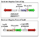 Fig. S3. Map of the heat shock-inducible dominant-negative Yap and Tead4 transgenes. A dominant-negative form of Yap or Tead4 was inserted under the hsp70 promoter. GFP was used as the indicator for transgene expression with 2A peptide. tdTomato under control of the γ-crystalline promoter was included to select for transgenic individuals. The γ-crystallin-tdTomato cassette was inserted in the reverse and forward direction in the hsp70-dnYap and hsp70-dnTead4 cassette, respectively.