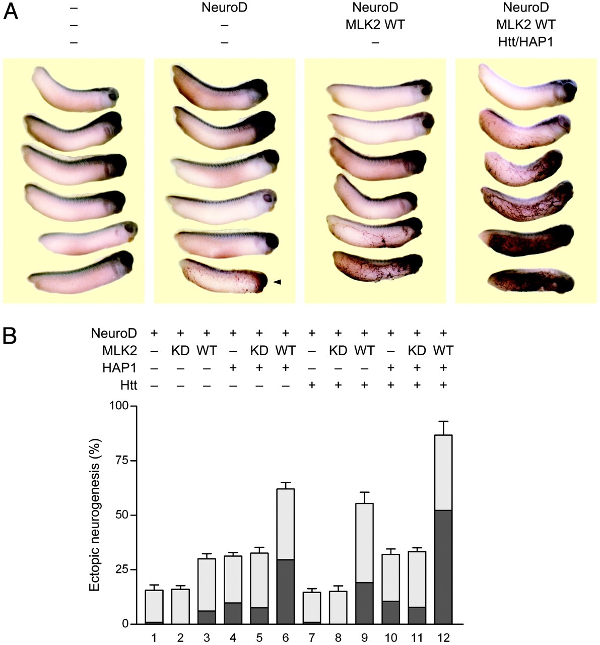 Fig. 4. Htt, HAP1, and MLK2 activate ND. (A) Xenopus embryos were injected in one blastomere at the two-cell stage with various combinations of mRNA as indicated. Formation of ectopic neurons induced by ND was visualized as dark staining at the tail-bud stage by whole-mount immunostaining with an antibody against the neuronal marker N-CAM. A limiting amount of ND mRNA was used to elicit a minimal neurogenic response when injected alone (indicated by the arrow, Left Center). Results shown are representative of at least three independent experiments. (B) Quantitation of ectopic neurogenesis induced by ND. Bar graph shows mean percent of Xenopus embryos with ectopic neurons ± SEM of at least three independent experiments performed as described above. Dark areas show mean percent of Xenopus embryos with extensive and intense ectopic neurogenesis.