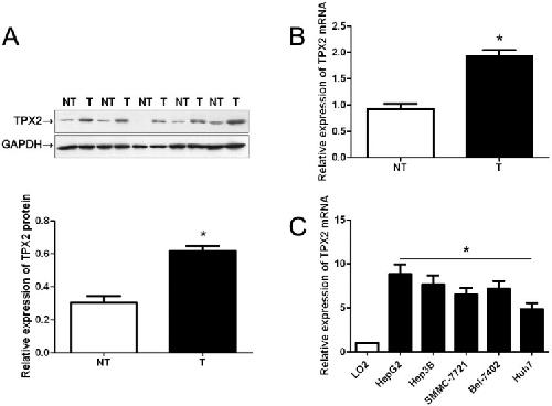 Figure 1. The expression levels of TPX2 in hepatocellular carcinoma (HCC) tissues and cells. Comparing differences in the expression levels of TPX2 between (A) and (B) HCC (T) and matched nontumor tissues (NT) (n = 20), and (C) HCC cell lines and the immortalized hepatic cell line LO2 (n = 6). Values are depicted as Mean ± SEM; *