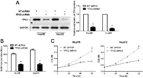 p < 0.05 by t test; (B) Cell proliferation as measured by BrdU incorporation was inhibited by TPX2 knockdown in Hep3B and HepG2 cells. *